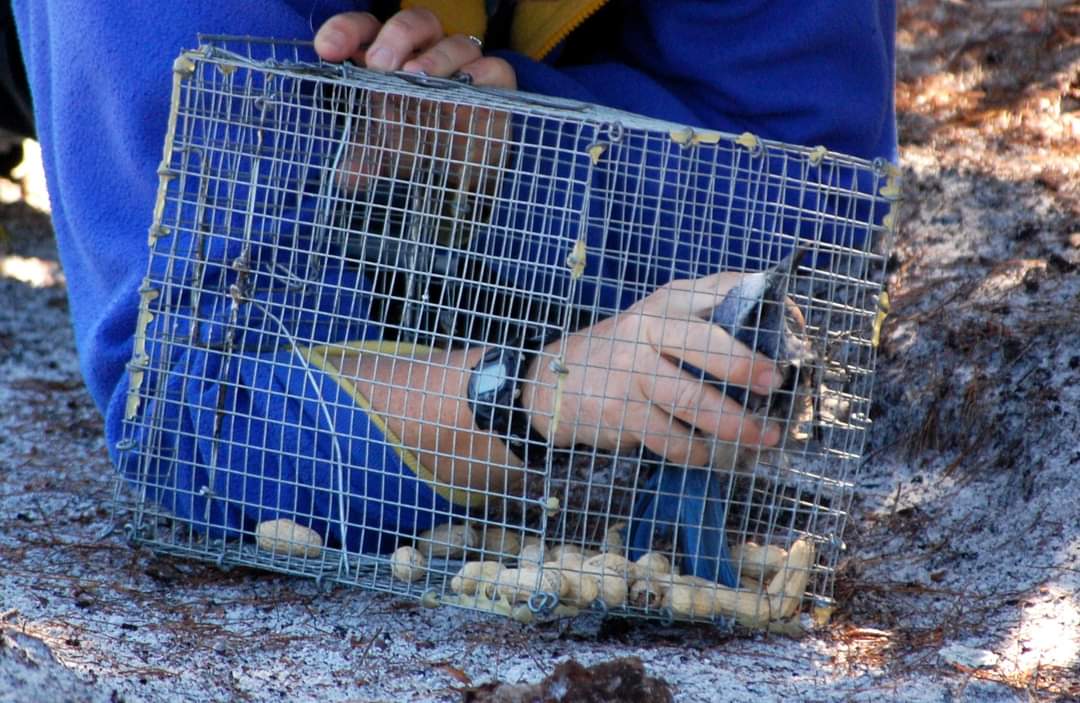 We had the opportunity to follow one of these professional bird banders and observe how they go about identifying these individuals. We were in an area where they were monitoring known populations and had found some new, unbanded individuals nearby. We went to an area where they had been seen, set up a trap with peanuts as bait, and played their calls to attract them to the area. Please keep in mind, trapping and handling these birds without a permit is a federal offense. These activities were performed by a licensed, professional bander for the purposes of studying this species to enhance its conservation.