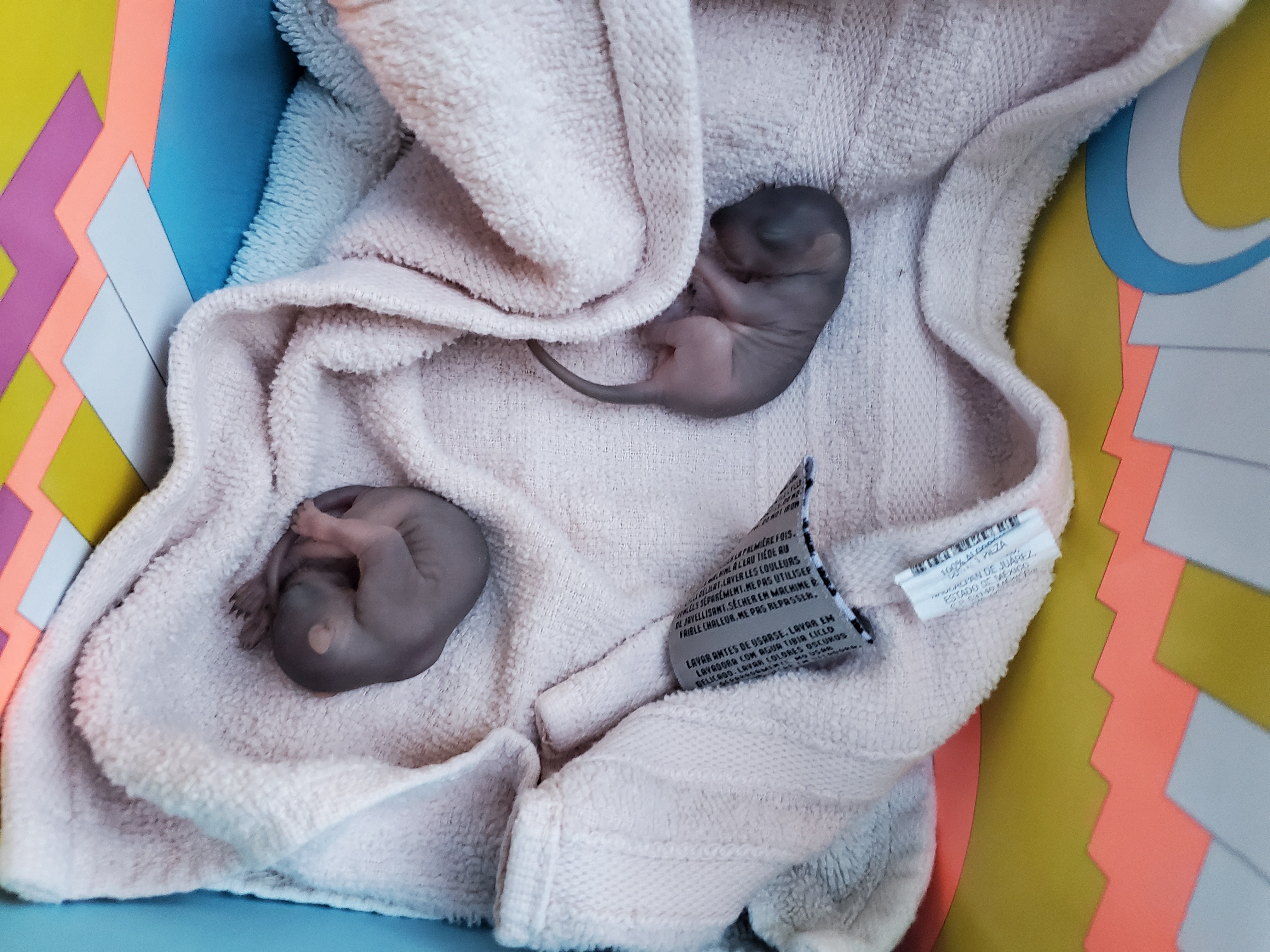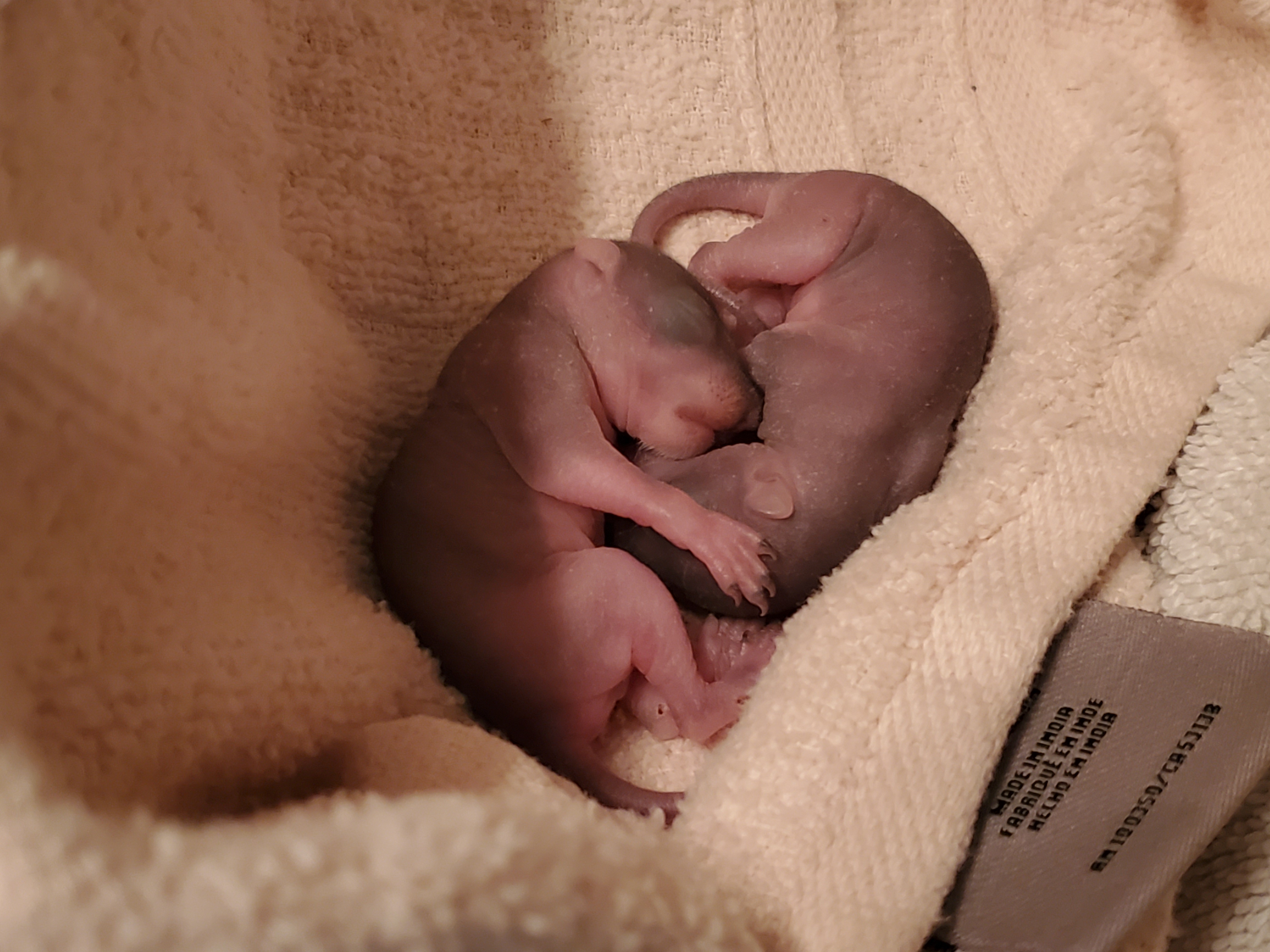 Squirrels nest in trees building their nests, which are called “dreys”, out of sticks, leaves, and grass. They will typically have between one and four young, which are referred to as “kittens” or “kits”. I was walking my dog one morning and came across a some kits on the sidewalk next to a nest that appeared to have fallen from a nearby tree. The best thing to do if you ever find baby squirrels outside the nest is to leave them alone and play a squirrel call. The idea is that the mother will see her young are in danger and retrieve them. However, not only did this not work, but the way the nest was on the ground and away from the tree made me think the mother might have been grabbed by one of the many hawks in the area. So I picked them up and put them in a box with a little heating pad until they could be picked up by a wildlife rehabilitation clinic. In the time it took for them to get to me, they had actually clung to each other. Based on the lack of fur, but the appearance of darker skin color, I estimated them to be between seven and ten days old.
