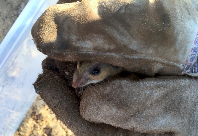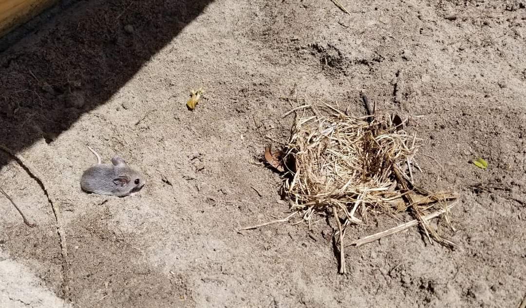 Mice are what we more commonly find in tortoise burrows. Mice belong to the rodent family, named for the Latin rodere meaning “to gnaw”. One that is very common, not only in tortoise burrows but really anywhere they can find a hiding place is the house mouse (Mus musculus). Like the opossum, they will bring grass clippings and other debris into a burrow to make a nest. The one below was just pulled out of a burrow and is a little disoriented, but we monitored it and when it got its bearings, it took off for another hiding spot. Below that is one with a nest that I found under a board.