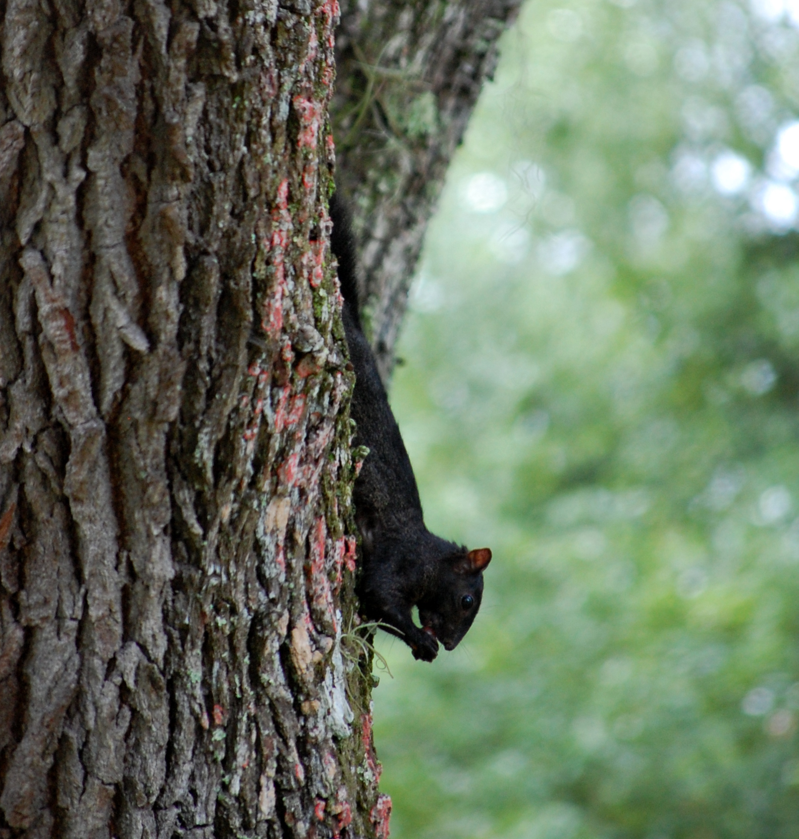 While squirrels usually eat seeds, nuts, berries, etc., they will occasionally like frogs, insects, and smaller mammals and birds. They have also been known to gnaw on antlers, turtle shells, and bones to gain extra minerals that their normal diet lacks. That’s likely what is happening in the photo below, where I found a squirrel nibbling at a chicken wing bone it found in a park. Below that is what is known as a “melanistic” gray squirrel. Out of the hundreds of thousands of squirrels I must have seen in my lifetime, this is the only one I’ve ever encountered with melanism. This is the condition of the dark pigment in the skin, known as melanin, having increased development, giving the entire animal a dark black color.