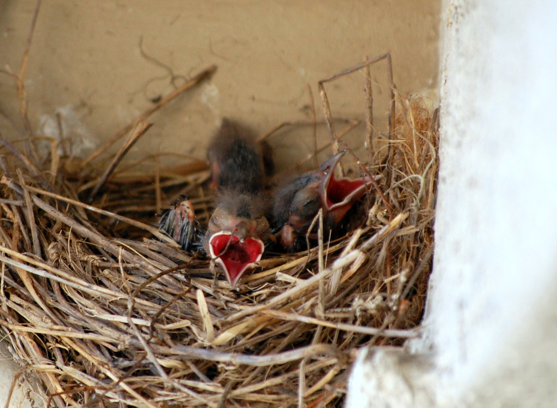 I’ll start with reproduction. Without getting into the messy details of how mating occurs in birds (feel free to look up the “cloacal kiss” if you really are interested), I’ll start with baby birds after they have hatched. There are basically two varieties of chicks with a wide range of hybrids in between. These two varieties are known as altricial and precocial. Altricial chicks are featherless, have no means of temperature regulation, and are born with eyes closed. Precocial young are feathered, can regulate temperature, and are much less dependent on the parents for food. You may recognize the bright yellow border around the mouths of the altricial chicks. This is known as a “gape flange” and serves two purposes. First, it serves as a bright target for the feeding parent to aim for when feeding. Second, it is filled with sensitive nerve endings that, when touched, stimulate the baby bird to open its mouth widely. Below are examples of altricial and precocial young, respectively, each with the same approximate age (approximately one week). I feel I should point out that, as always, I did not coax the parent away from the nest. I noticed a pattern of the parent leaving for food, kept track of the amount of time the young were left unsupervised, and got in a quick photo while the parent was gone, never disturbing the parent or young in the process.
