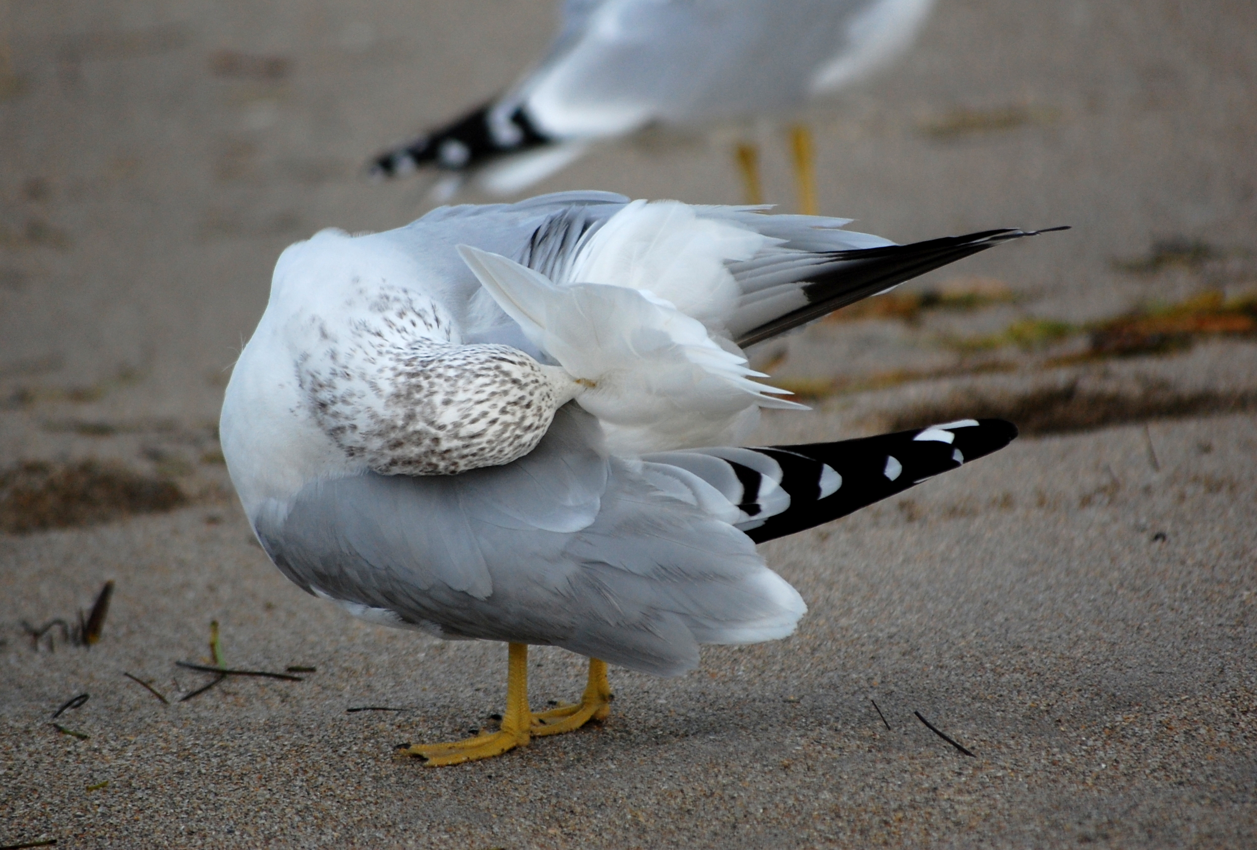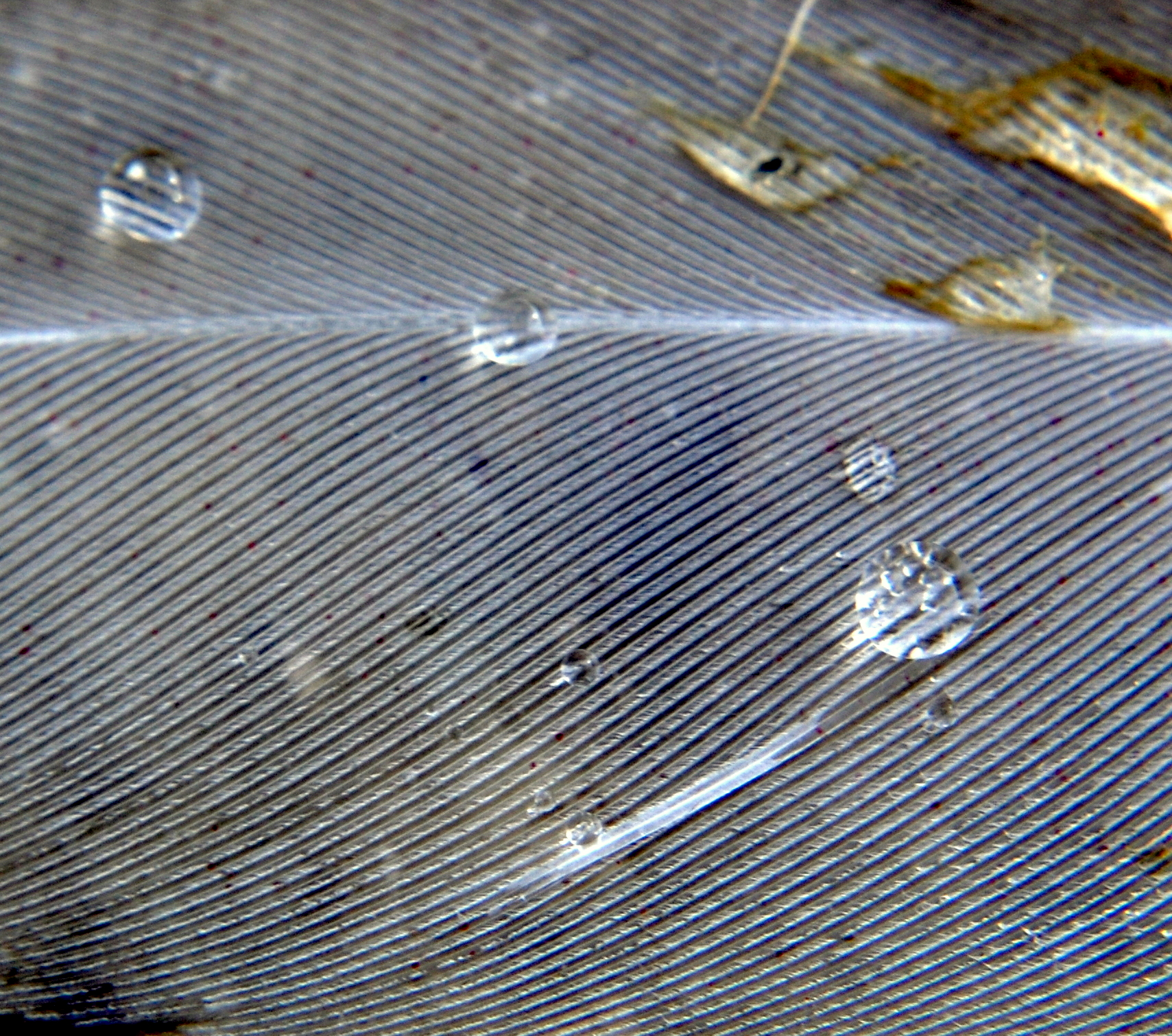 Sticking with the theme of cleanliness, everyone has seen birds preening. However, many people don’t realize just how fascinating of a behavior this actually is. Aside from picking away pests and dirt, birds have to maintain the integrity of their feathers. There are actually several increasingly small parts that make up a feather. The main stem is called a rachis. From here, small outcroppings called barbs stretch out like the branches of a tree. Each barb also has outcroppings called barbules. These barbules are interwoven amongst each other with tiny hooklets. Each of these microscopic components make up the seemingly solid feather. These hooklets will separate from each other periodically and the bird needs to preen in order to “zip” them back together. In the second photo below, you can see where one of the barbs has come loose near the bottom. If you zoom in enough, you can just barely see the sort of frayed look of the barbules.