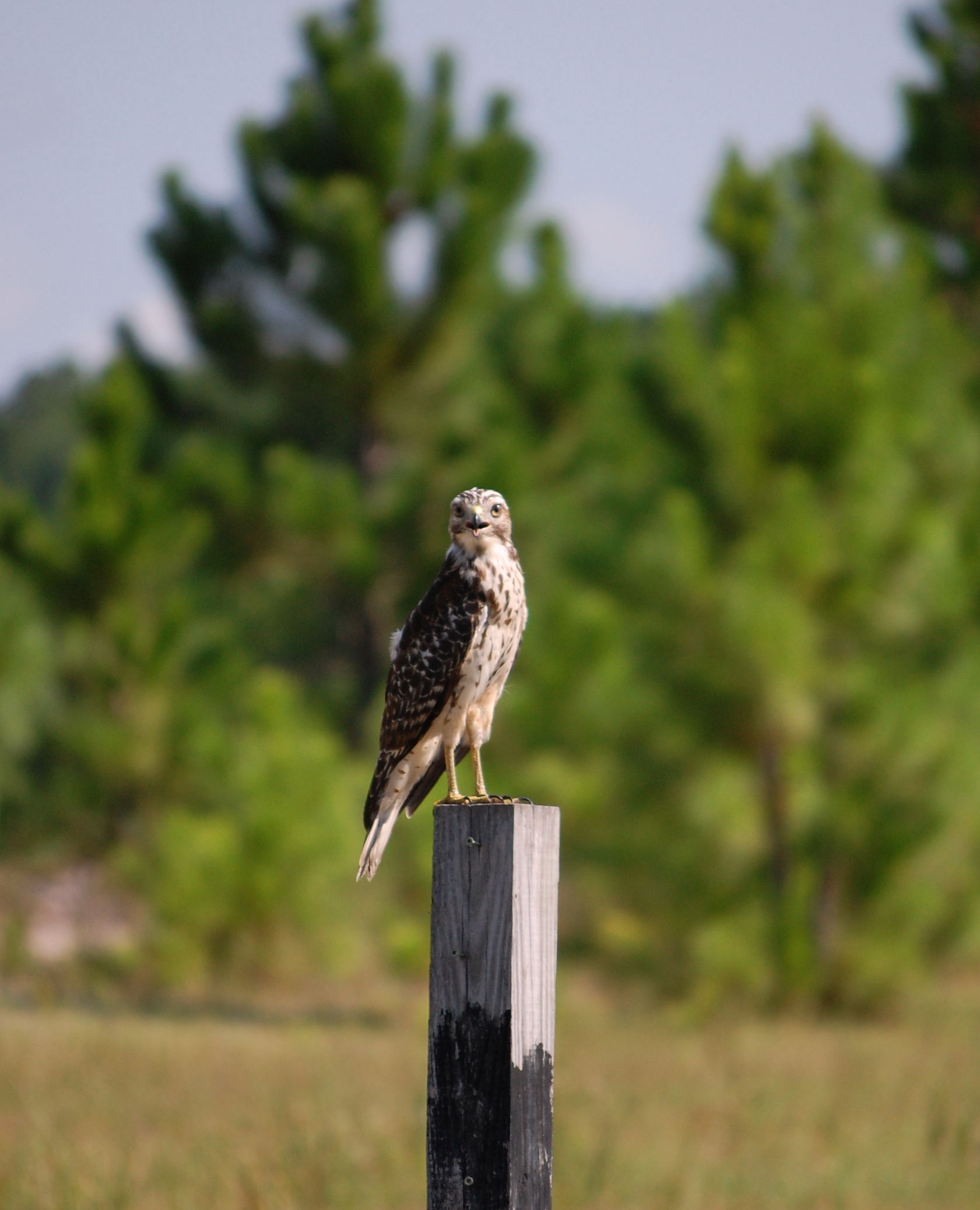 The red-shouldered hawk gets its species name from the Latin lineatus, which means “marked with lines” presumably due to the linear pattern on the tail and the barred (broken line) pattern across the wings and chest. It is common throughout the eastern US and can readily be identified through its call. It’s also common to see them being mobbed by their nemesis, the crow, a behavior in which the crow will dive bomb and harass the hawk into leaving a particular area. They are also known to steal food from each other. However, they have also been known to join forces and work together to chase away great horned owls. The photo below is of a young red-shouldered hawk. If the background looks familiar, it’s because this is the same bird that was used in the introduction to birds when describing the “angle of attack” during flight.