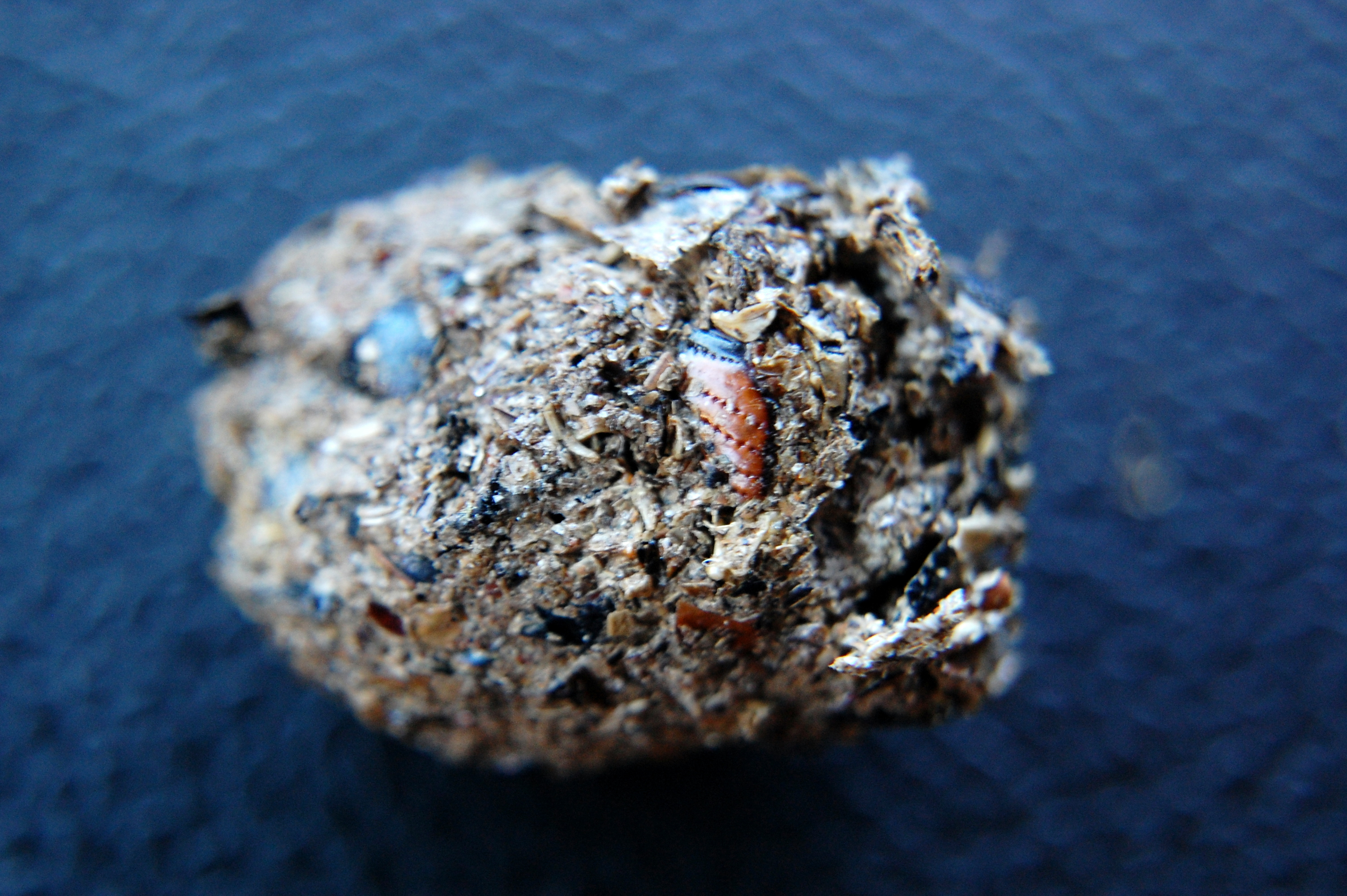 For example, the photo below is from a burrowing owl. The contents included mostly insect parts. Pellets from fish eating species tend to be black and have a sort of greasy consistency. A pellet from a species that preys on small mammals would be made up mainly of hair. I dissected a pellet from one of our owls when I worked at the local zoo and found something very interesting. Despite her having a strict diet, I found a part of a frog skull. So, despite having been hand fed for most of her life, she still had the hunting skills necessary and apparently caught a frog while out in the yard.