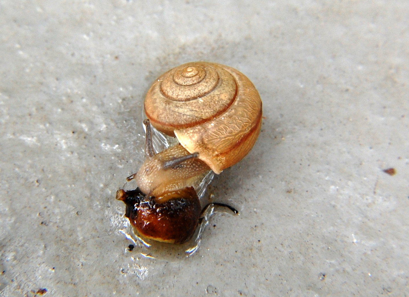 There’s a good chance I’m wrong on this next one due to so many small, circular snails looking the same. However, the lighter, slightly flared portion of the shell makes me think this may be a white-lipped globe (Mesodon thyroidus). I know that meso- generally means “middle” and -don generally refers to “tooth”. The species may be a combination of the Greek thureos meaning “oblong shield” and oides meaning “resembling”. In the first photo you can again see the blood vessels near the shell’s surface. This one was feeding on some sort of seed or nut on the wet sidewalk. While snails don’t have teeth, they do have a rough, ribbon-like organ called a radula (Latin for “little scraper”). The radula is used to scrape food items off of a surface. If you look carefully, you can see the lighter parts of the seed where the darker outer skin has been removed.