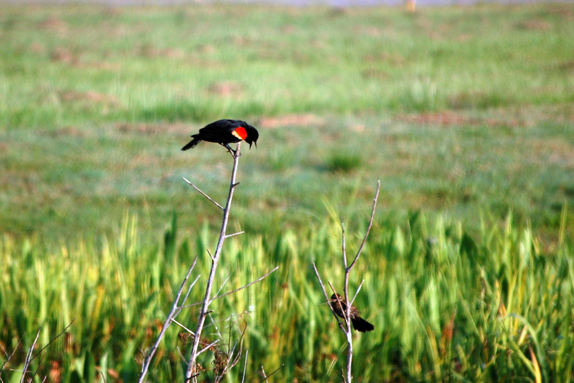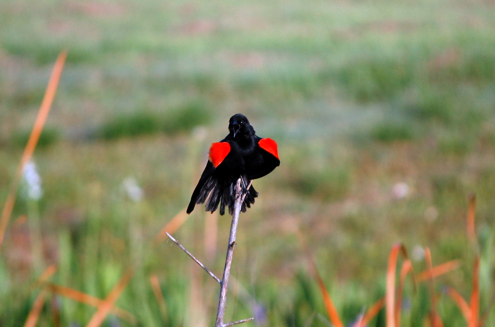 I mentioned that behavior is one of the things I find interesting about this bird. I was specifically referencing this calling behavior. As in the photo above, the male will generally get as high up as he can in order to be seen. During the last syllable of the conk-la-ree call, he spreads his wings slightly to accentuate the red feathers to show off. These bright wing spots are known as “epaulets”, named after the shoulder adornments used by the armed forces to indicate rank.