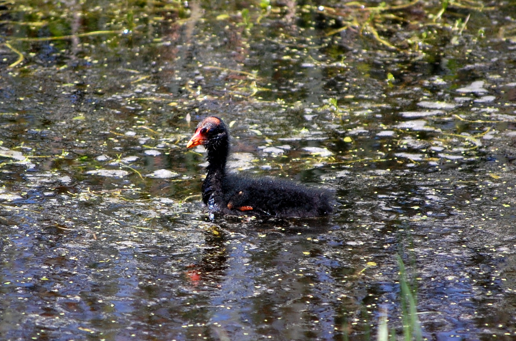 Young moorhens have spurs on their wings that they use to grip vegetation to help them get to the nest, or grab onto vegetation to get out of the water. The spurs aren’t visible in the photos below. However, in the second one, you can see the young chick attempting to grab onto nearby vegetation.