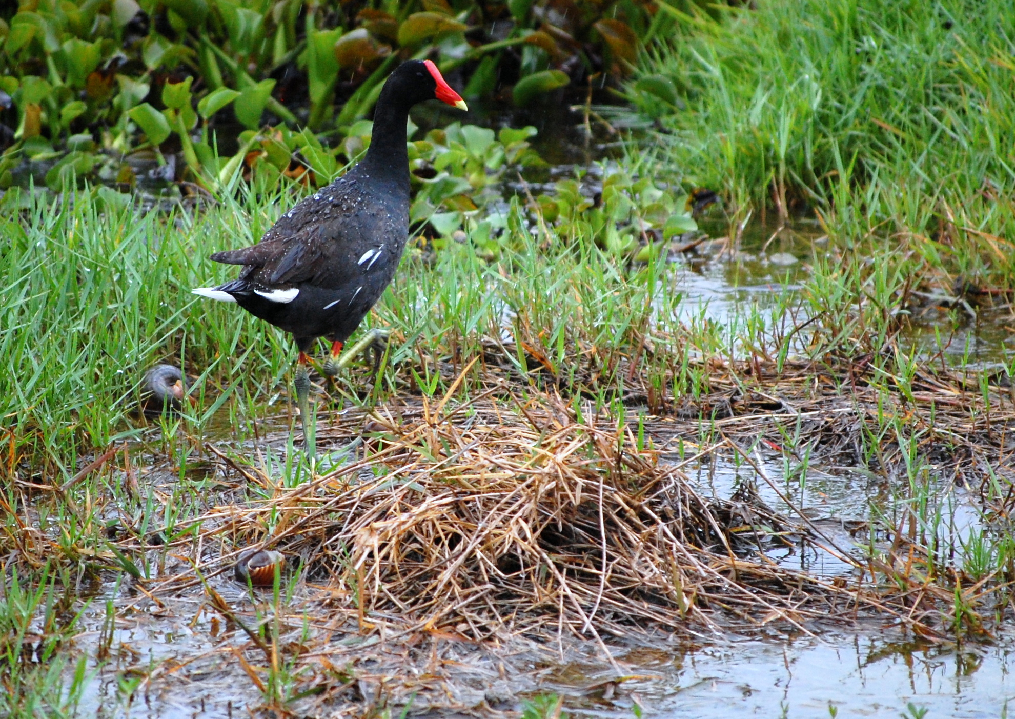The final bird that I would say is common in this area is the common moorhen or gallinule (Gallinula chloropus). Gallinula is a Latin term meaning “little hen”. The species name is a combination of the Greek khloros meaning “green” and pous meaning “foot”. As you may have guessed, the feet (and legs) are in fact green. However, as they are usually wading or swimming, you might not get to see the legs or feet. In fact, as this species can be a bit timid, you will usually hear them before you see them. One way that you can see their uniquely robust legs is when one is near a nest, which they build on floating patches of grass as the one below. The feet need to be robust for two reasons. One, they need the large surface area for walking through muck. Also, since the feet aren’t webbed, this large surface area helps this bird to be an excellent swimmer.