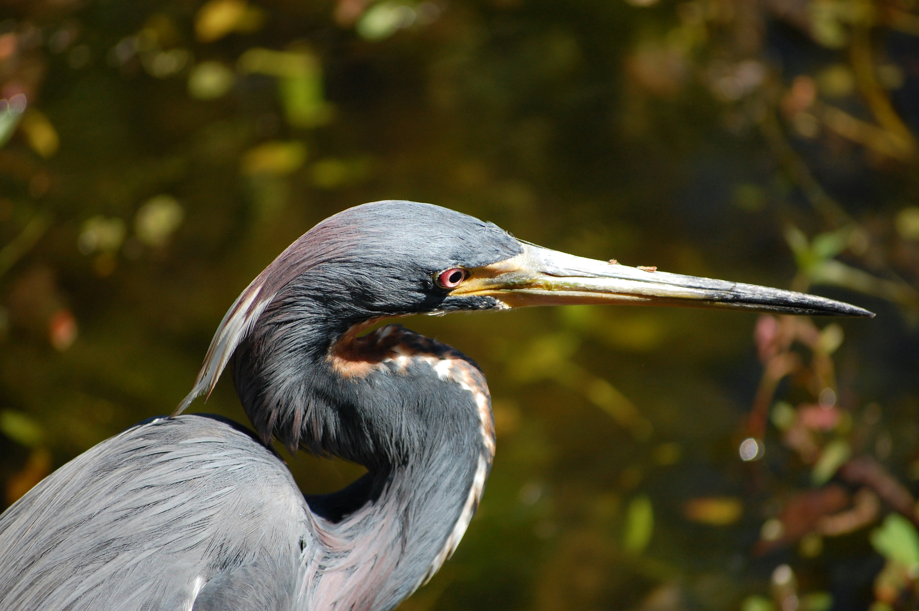 The species name for the tricolored heron is pretty obvious. In addition to the blue, there are also hints of red and, most obviously, white. While I took this photo a little too up-close to show all of the differences, one of the obvious things you can look for is the white stripe down the front of the neck.