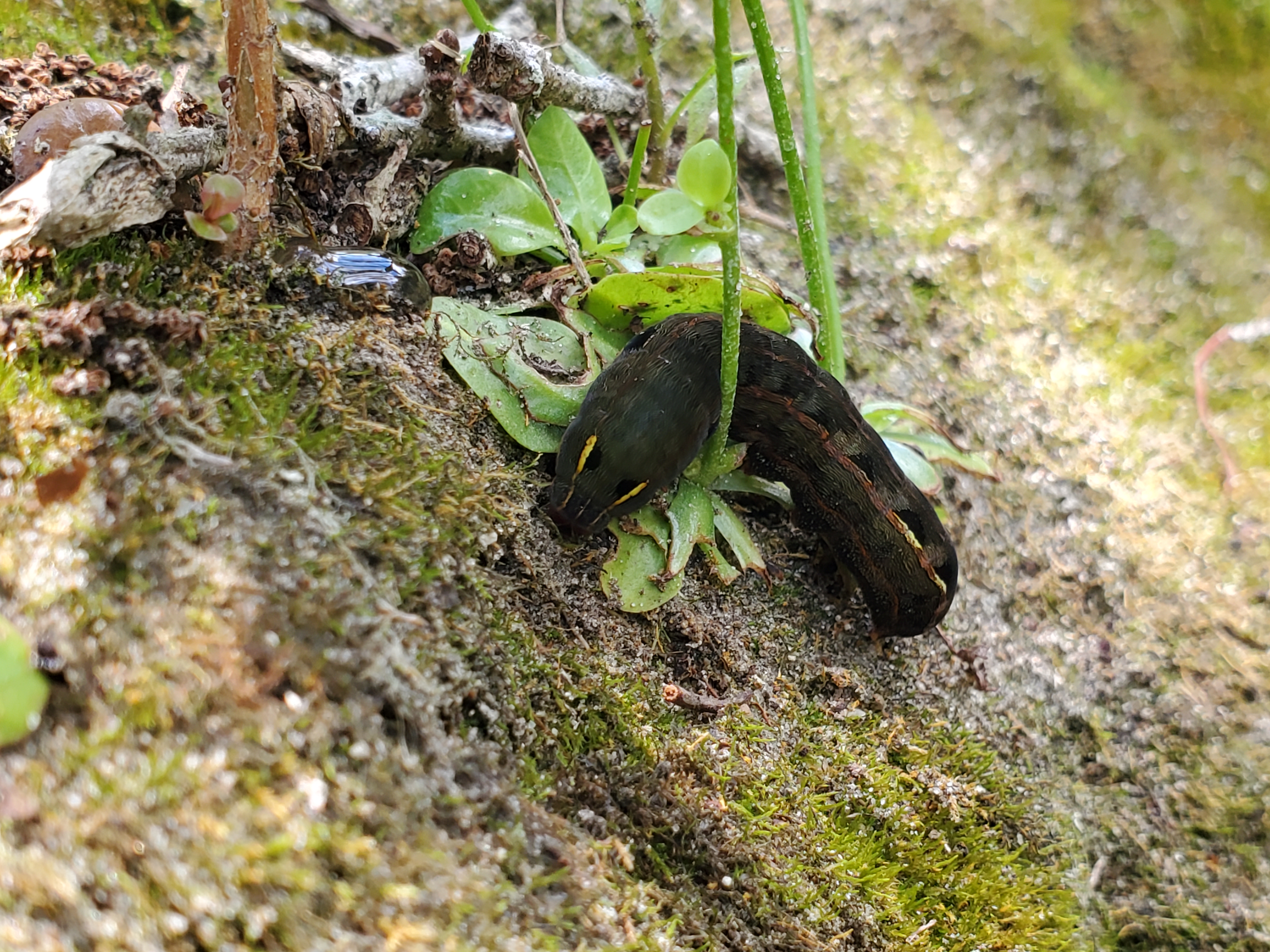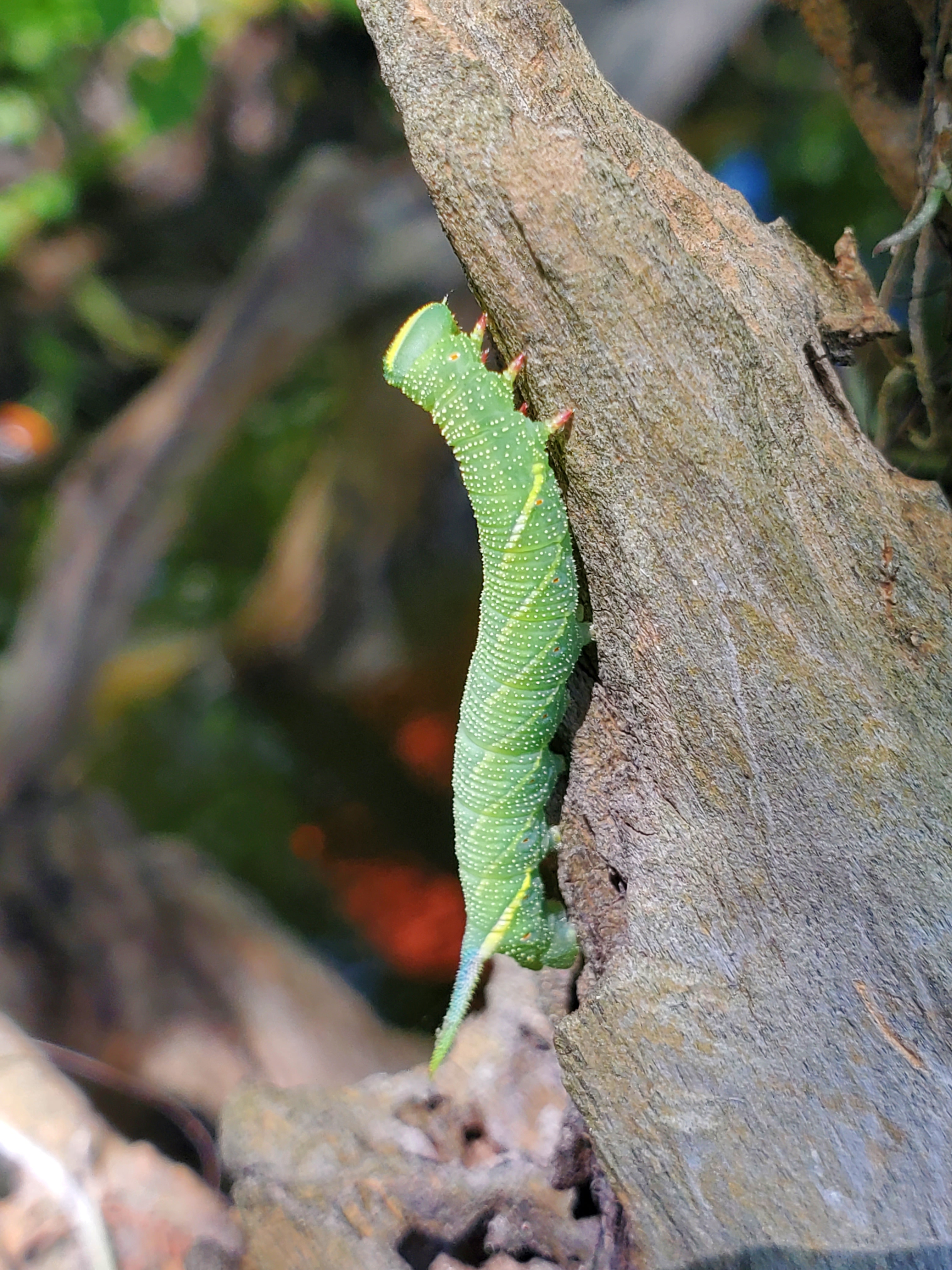 This next bug was very easy to spot. Usually found on green vegetation, this one somehow became stranded on some old cypress driftwood. It’s bright green showed very easily against the drab brown background. Despite being very conspicuous, it did a behavior I had never seen before but that I presume is some sort of tactic to make it look like part of a plant. It was crawling around normally as in the first photo. However, after I approached more closely, it raised the front of its body up, tucked its front legs under the head, and stayed perfectly motionless for several minutes. As far as the species, based on the lack of black stripes and the blue spike, I think this might have been a tomato hornworm (Manduca quinquemaculata), the larva of the five-spotted hawkmoth. The closely related tobacco hornworm (Manduca sexta) would have black accents on the yellow lines across the body and would have a red spike at the tail end.