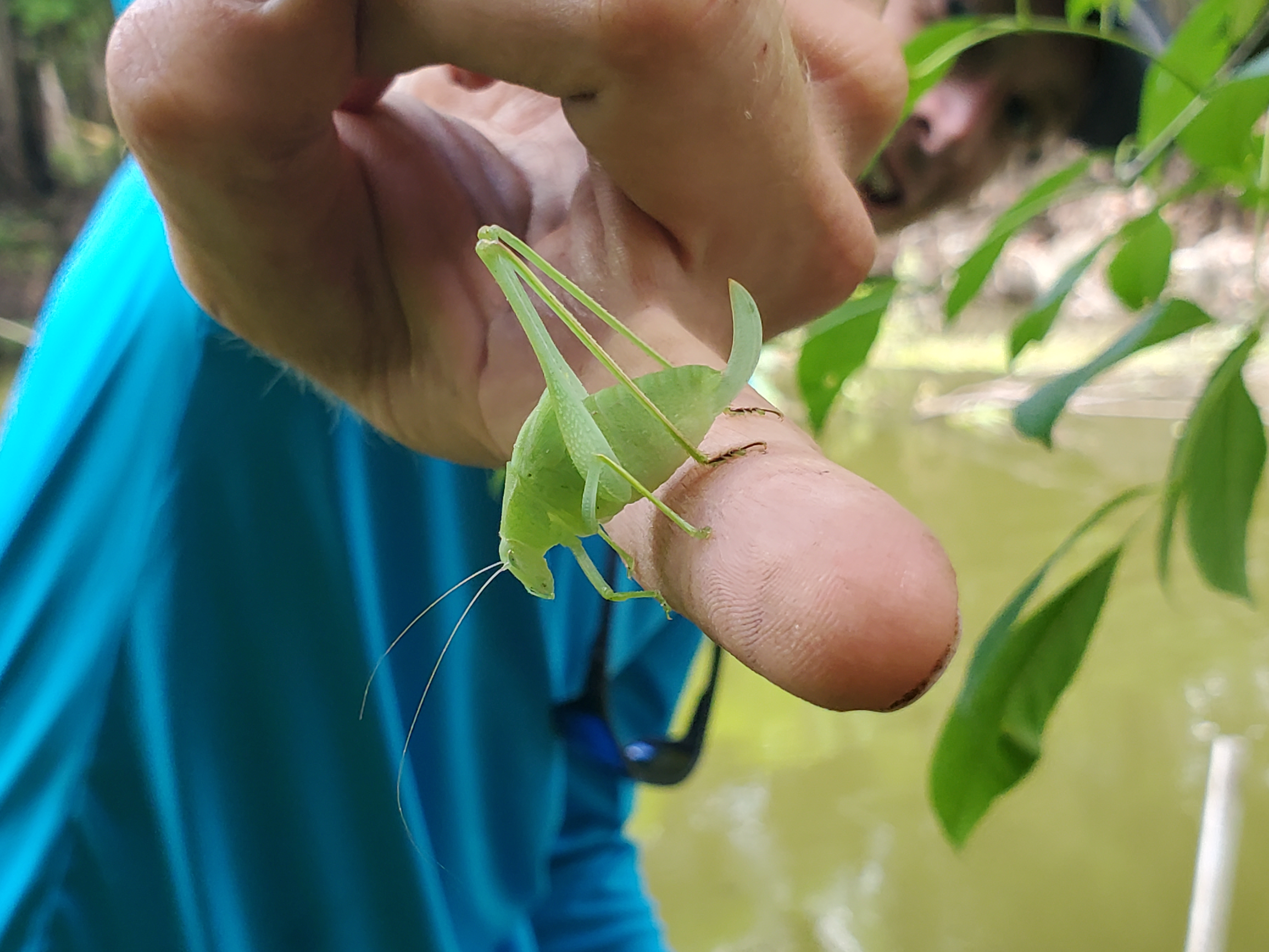 This next one is another one that I had trouble identifying due to its young age and lack of developed wings. However, my bug expert informed me that this is a round-headed katydid. I did some research and, from what I could find, there are two species in Florida that are very hard to tell apart without hearing their calls. However, based on the location, I believe this is a Florida false katydid (Amblycorypha floridana) as the other species, the oblong-winged katydid (Amblycorypha oblongifolia) is usually only found in the panhandle. Ordinarily I would prefer to photograph something in its natural environment rather than the finger of a coworker. However, this strong jumper leapt into the vegetation and immediately disappeared seconds after this.