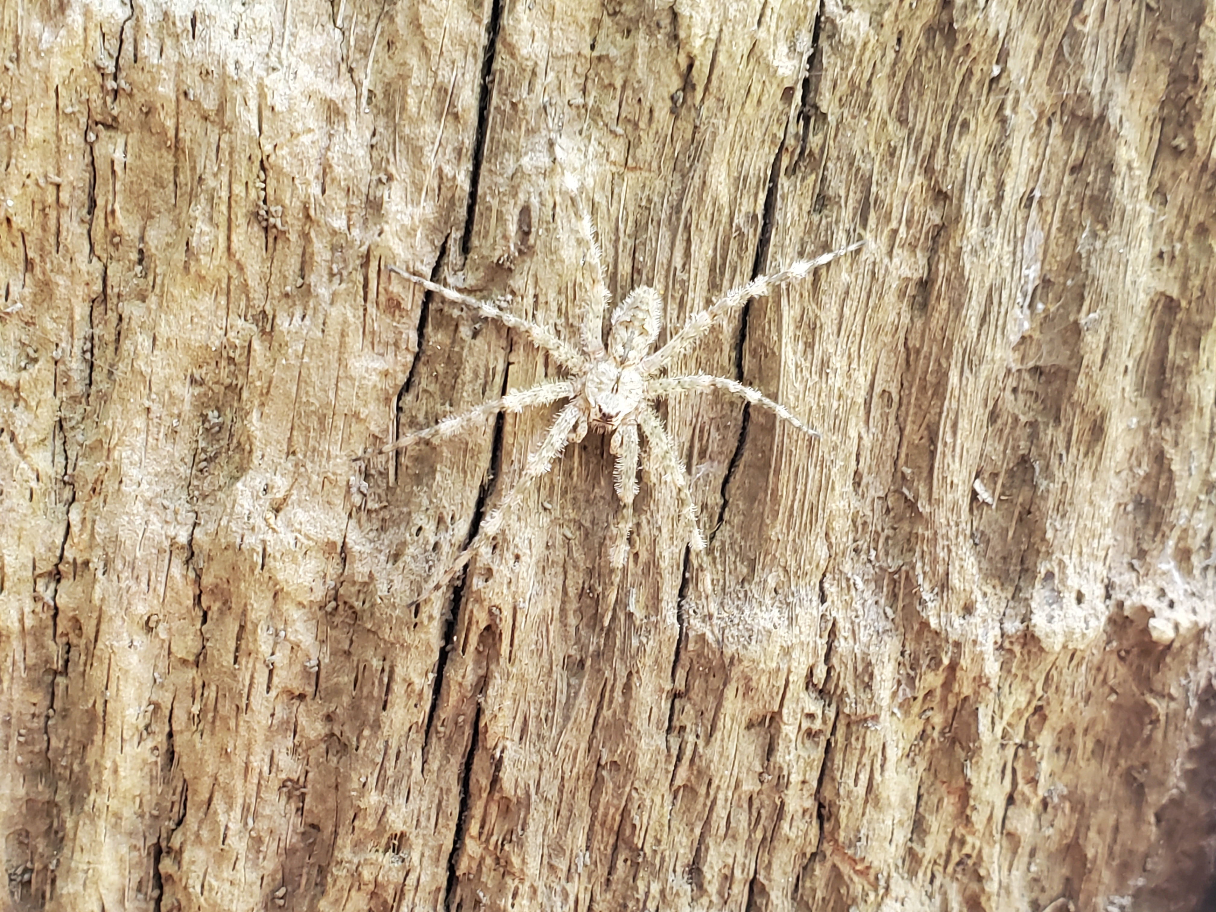 The next spider was nearly invisible. I was thankful I looked before I put my hand down on this guy. I say that not for my sake, as many of the spiders here in Florida are not very venomous and wouldn’t hurt more than a bee sting, but for its sake so I didn’t harm it. Again, not being a spider expert, I did my best to identify it and I think it may by a white-banded fishing spider (Dolomedes albineus).
