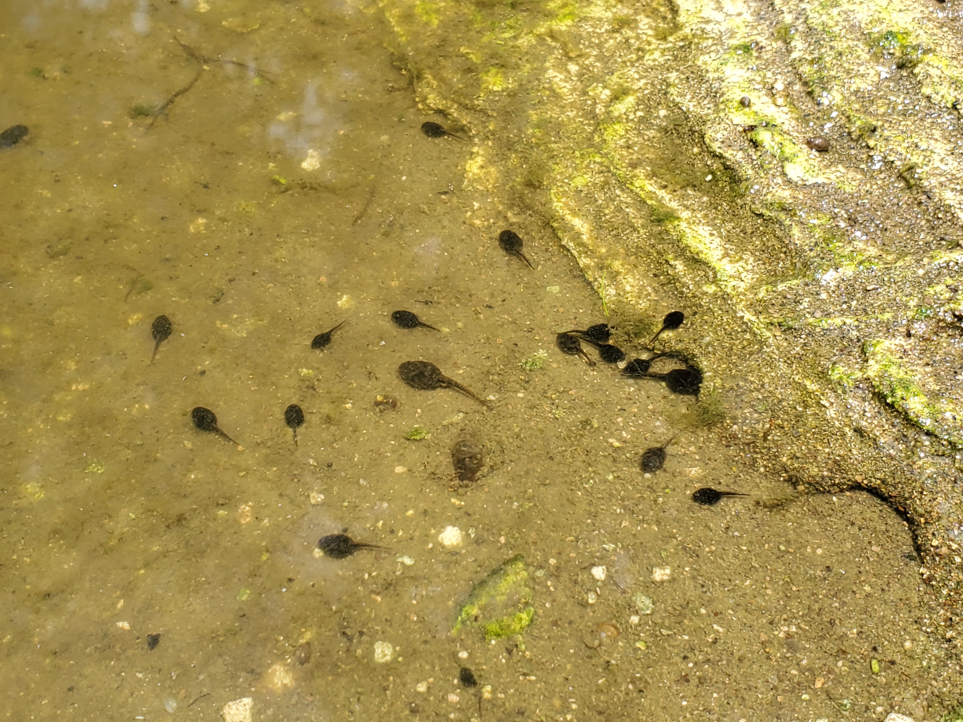 The name “tadpole” comes from the Middle English words tadde meaning “toad” and pol meaning “head”. My grandmother always refers to them as “pollywogs” which is derived from the pol for “head” and wiglen which means “to wiggle”. I don’t know enough about tadpole identification (and wouldn’t want to disturb them anyway) to be able to tell if there were different species here. However, I would guess that there are based on the different sizes. You can see one in particular in the middle of the photo that is quite a bit larger than the others. I think this might be a different species for a couple of reasons. First, it is my experience that tadpoles actually shrink as they mature. In fact, there is a frog known as the paradoxical or shrinking frog whose tadpoles are nearly a foot long but will shrink to a mere two to three inches. Secondly, I didn’t see any signs of limbs indicating that tadpole is in roughly the same stage of development as the smaller ones.