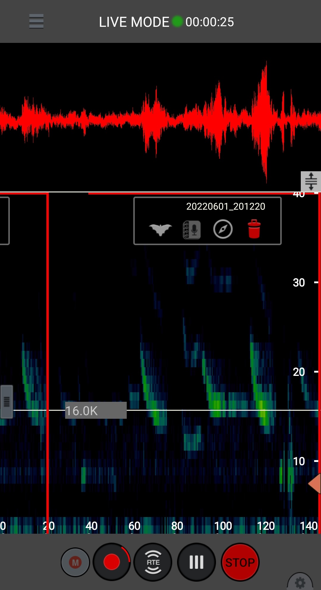 But I digress back to the emergence. If it wasn’t exciting enough to be able to see these animals, if only for a moment, we actually got to hear them as well. Thanks to some very interesting equipment from Wildlife Acoustics, we were able to use our phones and other devices to both hear and see their calls. A small microphone that plugs into the charging port of a device picks up their calls and a free app transforms them into something that can be seen visually. In addition, the program can adjust the frequency to a level that can be heard by humans and makes an attempt to identify the bat species based on the calls.