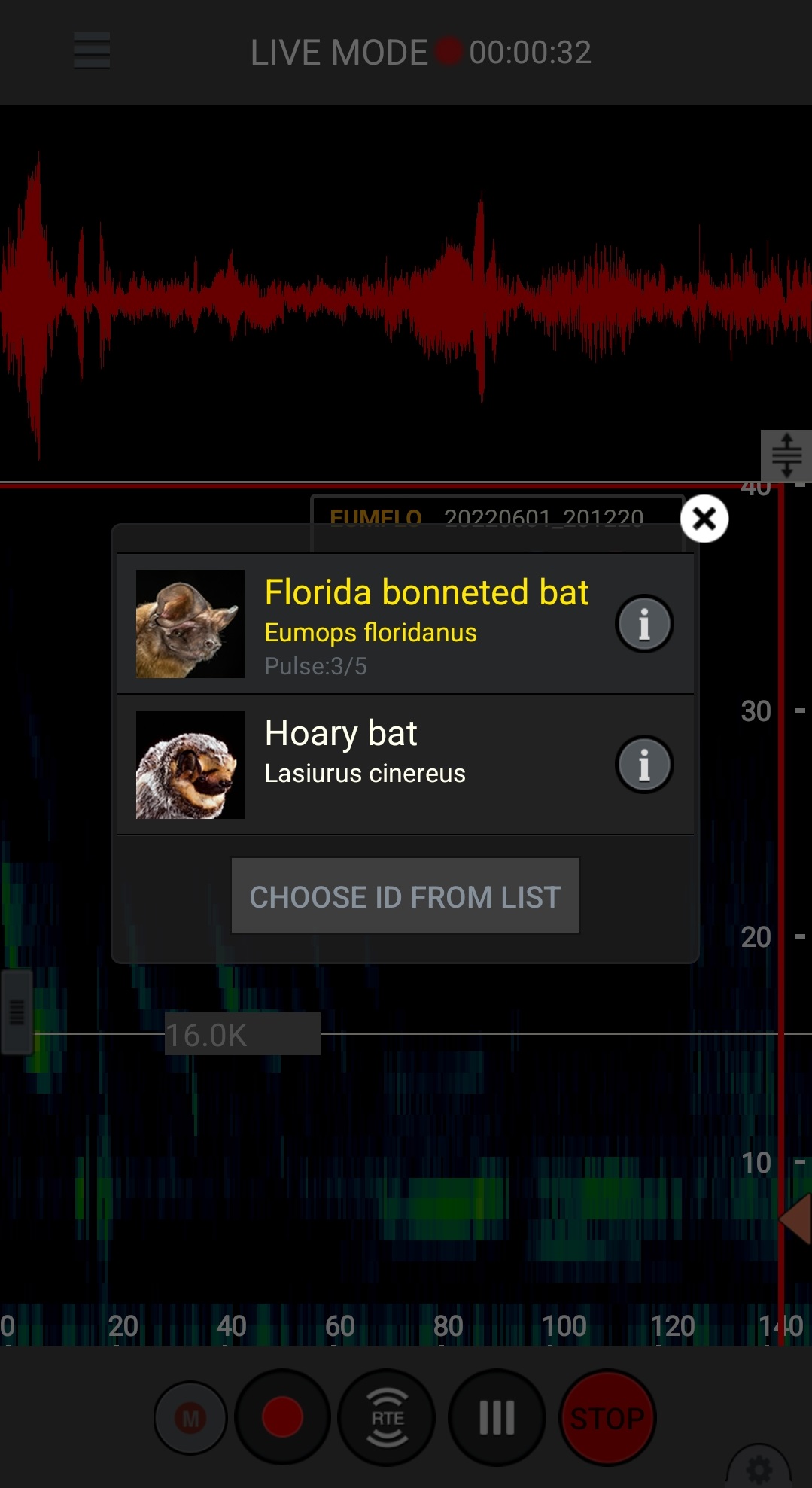The visual representation in the app is a much coarser version of what is provided by the software that we use for our surveys. We set up detectors with microphones programmed to “listen” for bat calls during the night. The detector takes audio recordings which are then run through the software to produce visual representations of the calls. It also provides quantified details of each call, such as the slope and duration, which we can analyze to tell if the call came from the species indicated by the software. The screenshot below is of one of the best Florida bonneted bat calls I’ve seen from one of our surveys.