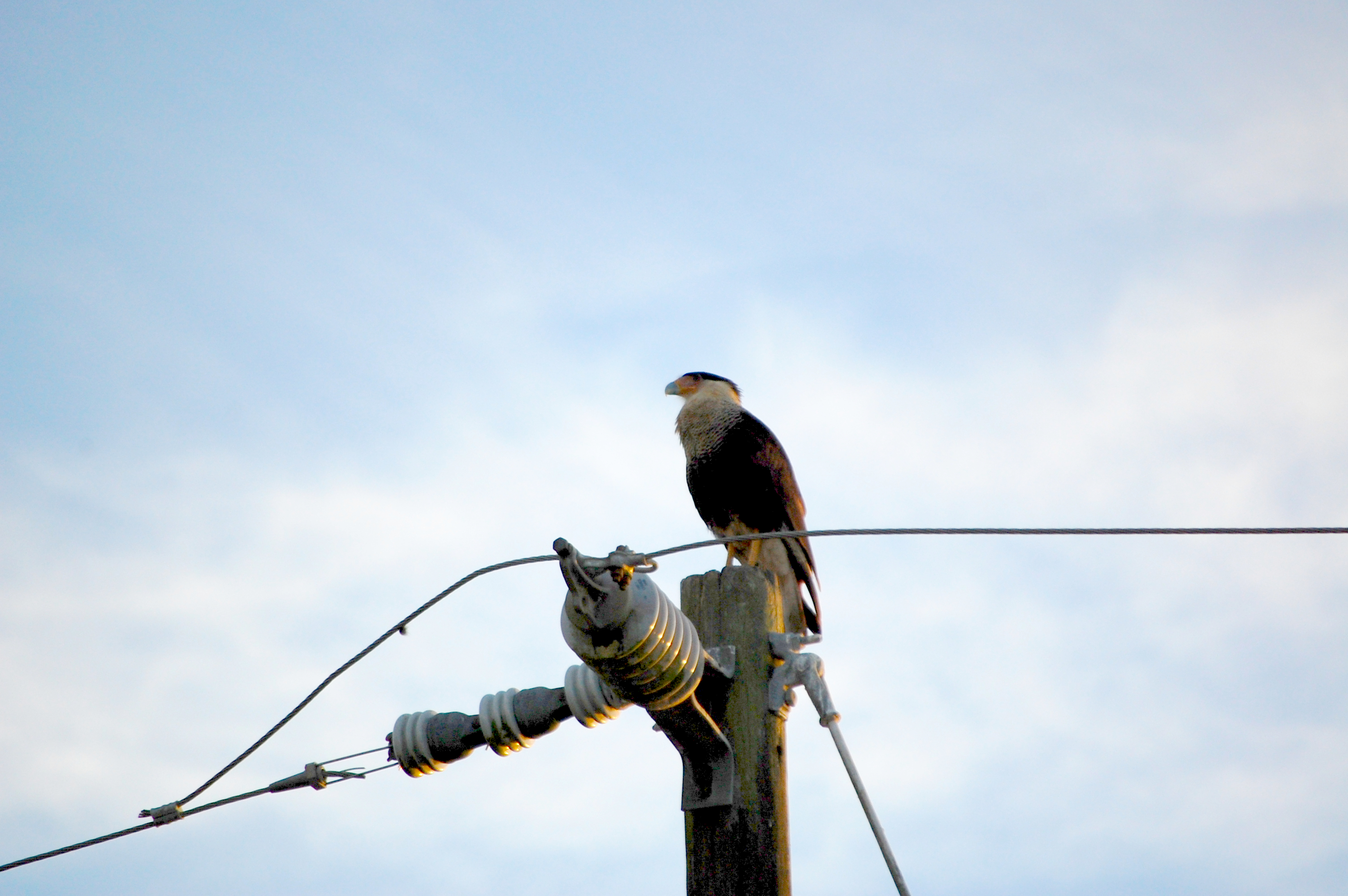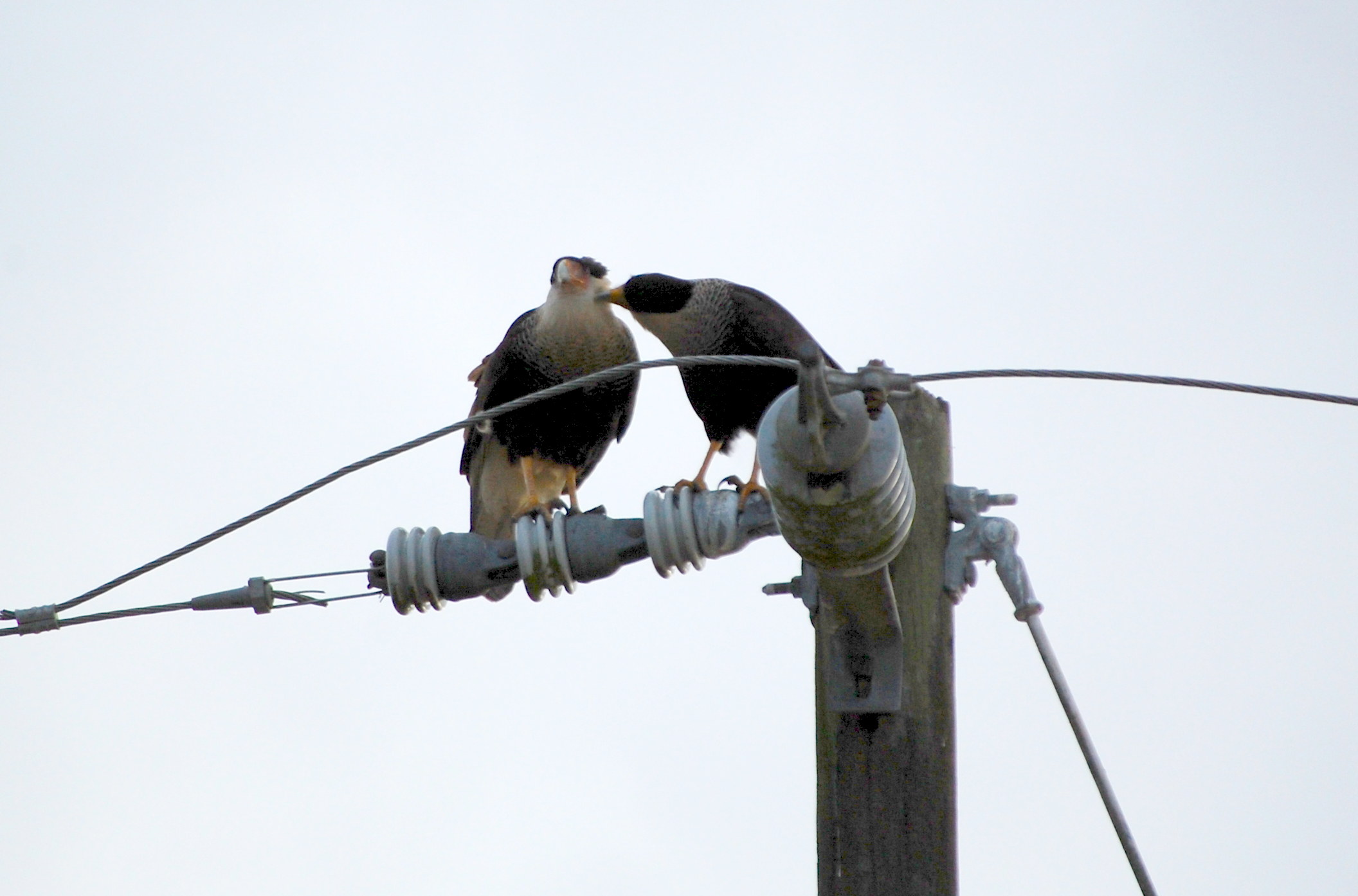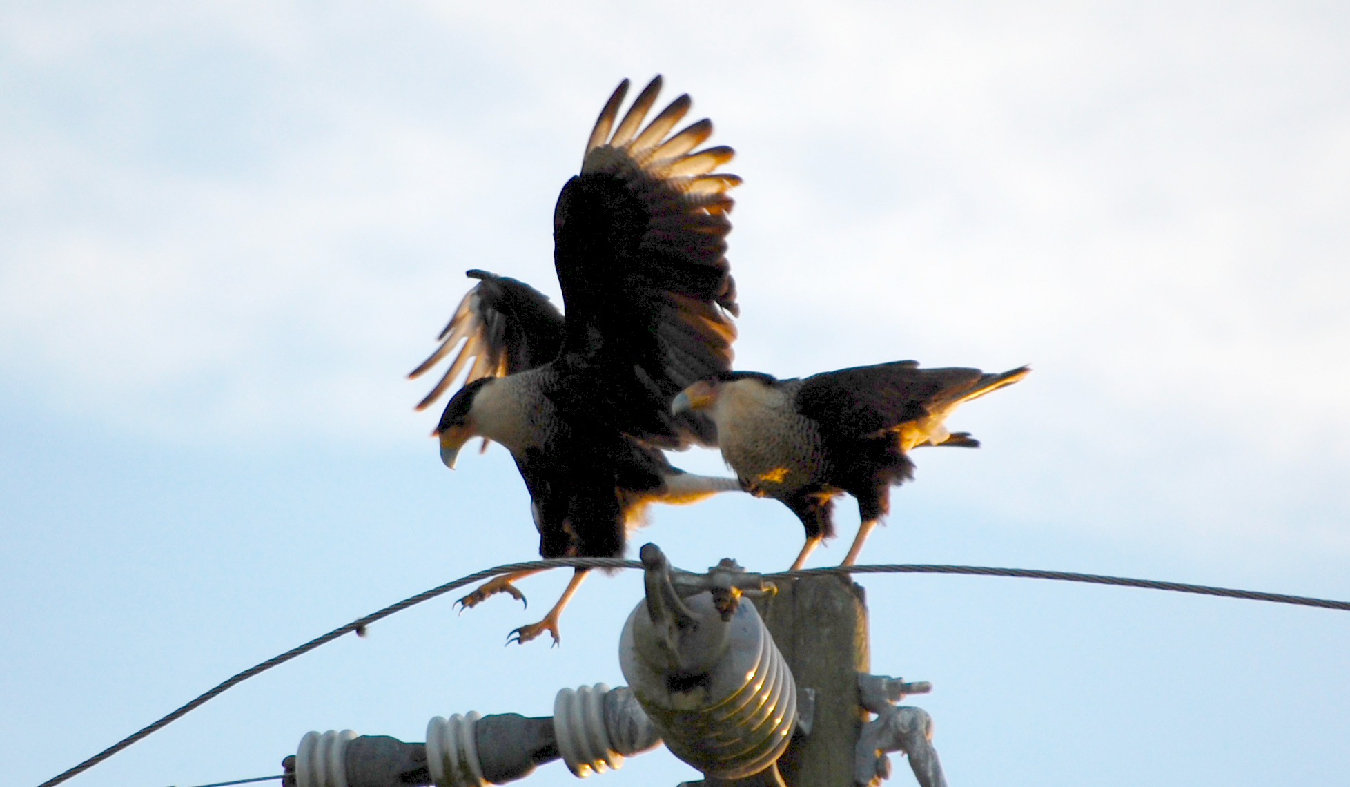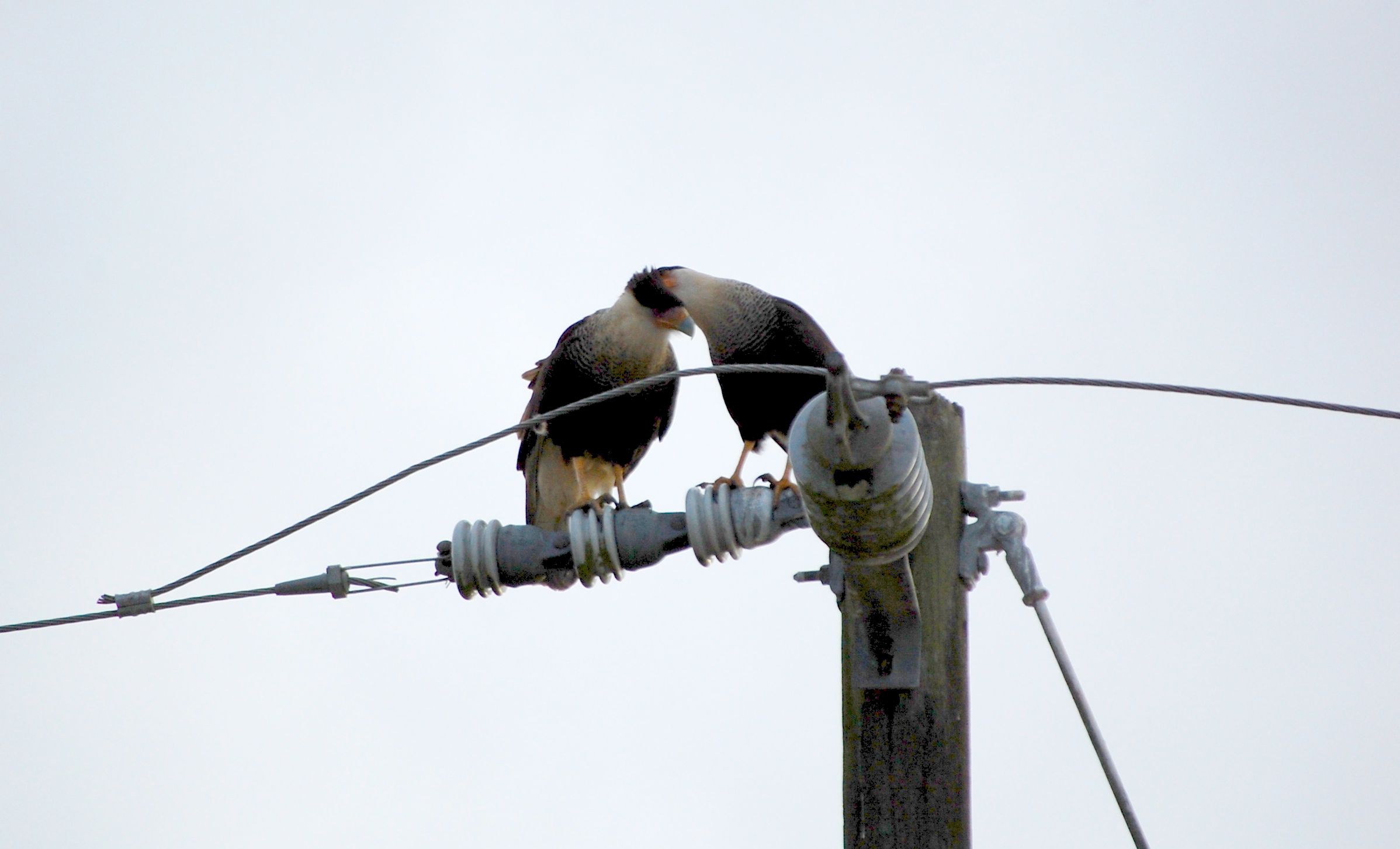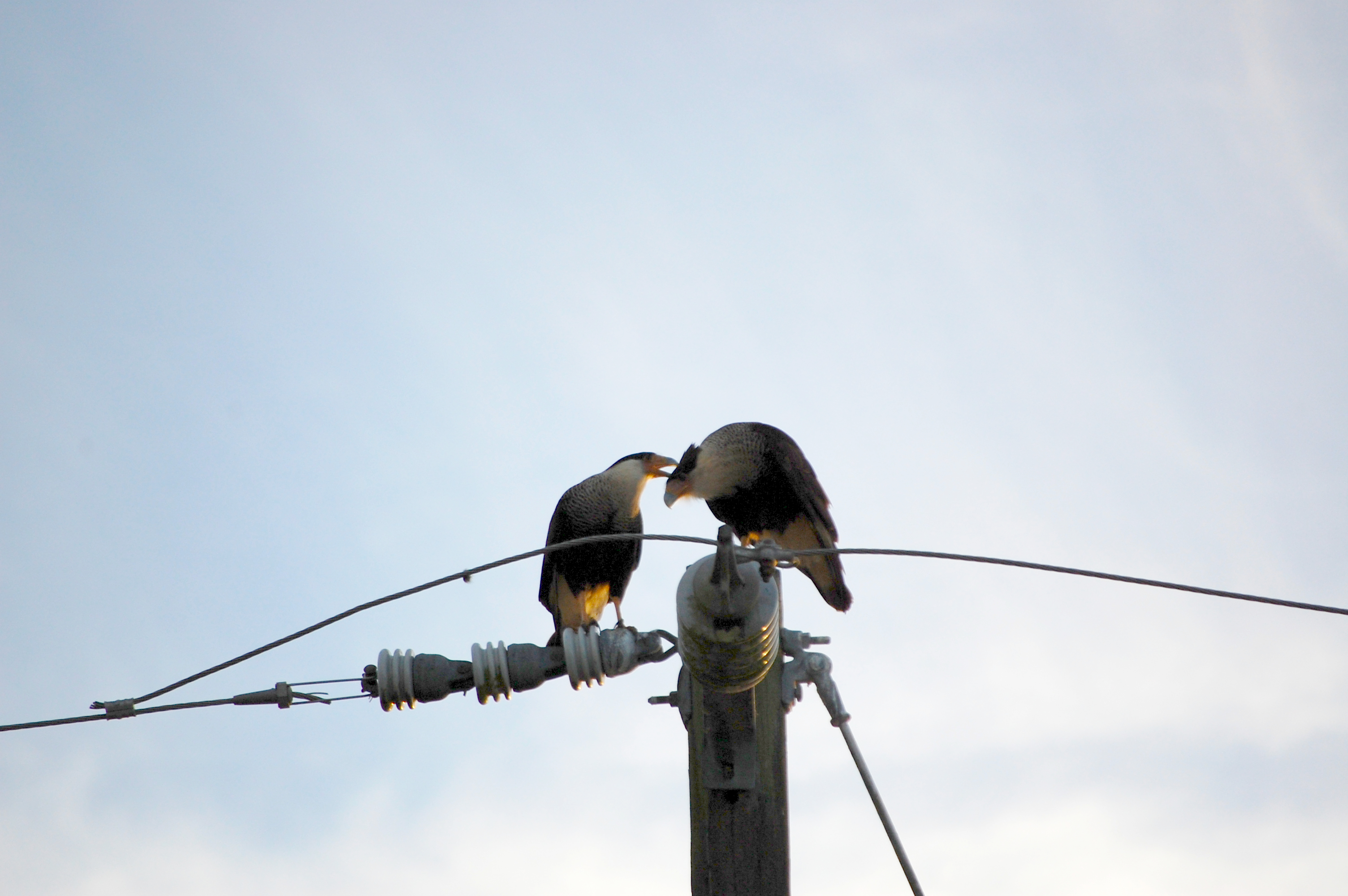 As I mentioned, the purpose of this monitoring was to determine if the construction was affecting the birds. As a result, it was very important that we didn’t do anything ourselves to alter their behaviors. Not only did we remain as quiet as possible, but we kept ourselves at a distance. Therefore, these photos aren’t the best and are sometimes oversaturated, a necessary edit I did to make them show as more than mere silhouettes. With all this said, here is a little bit of a caracara “love” story that I had the pleasure of observing.