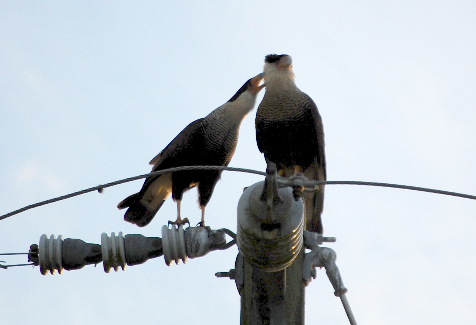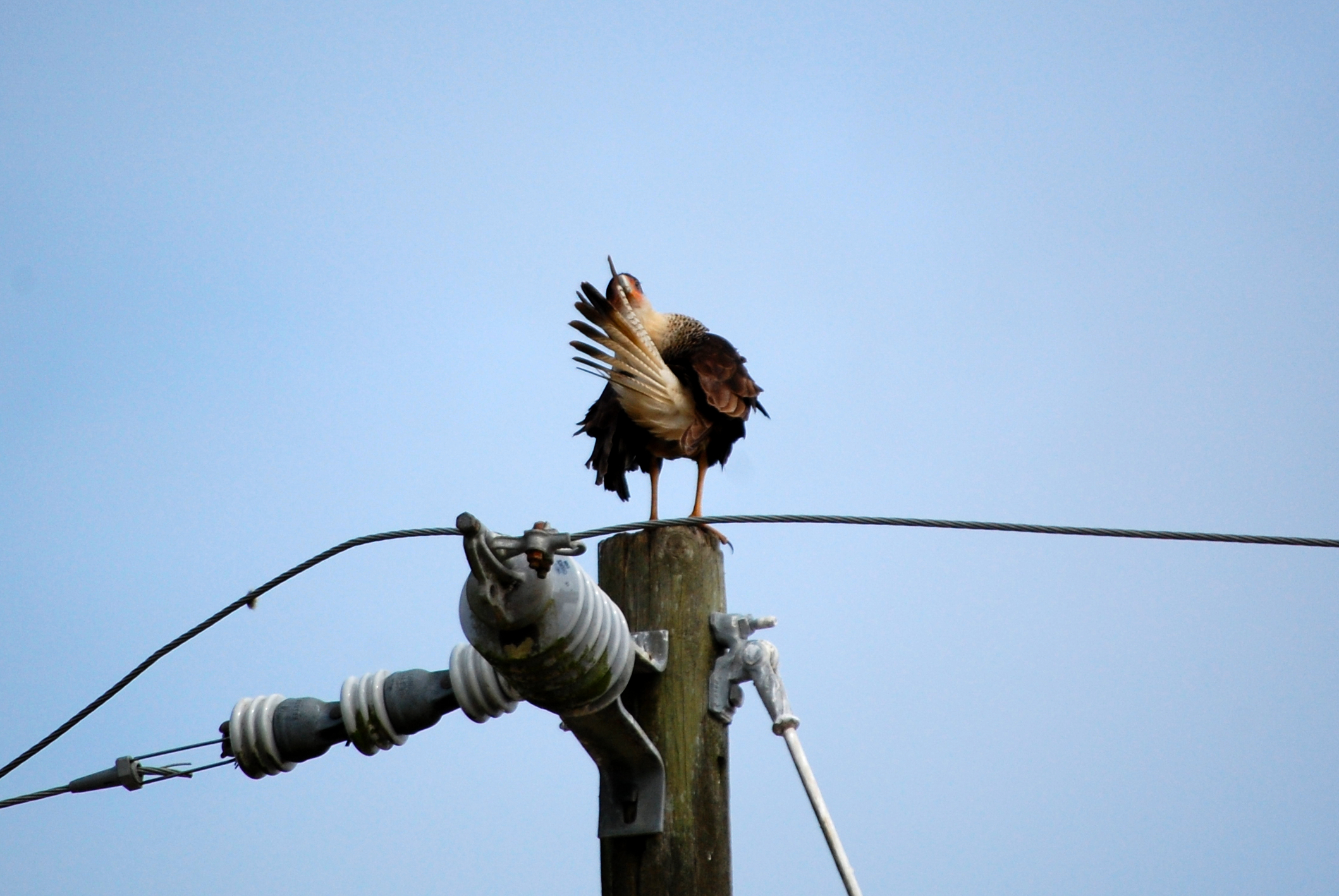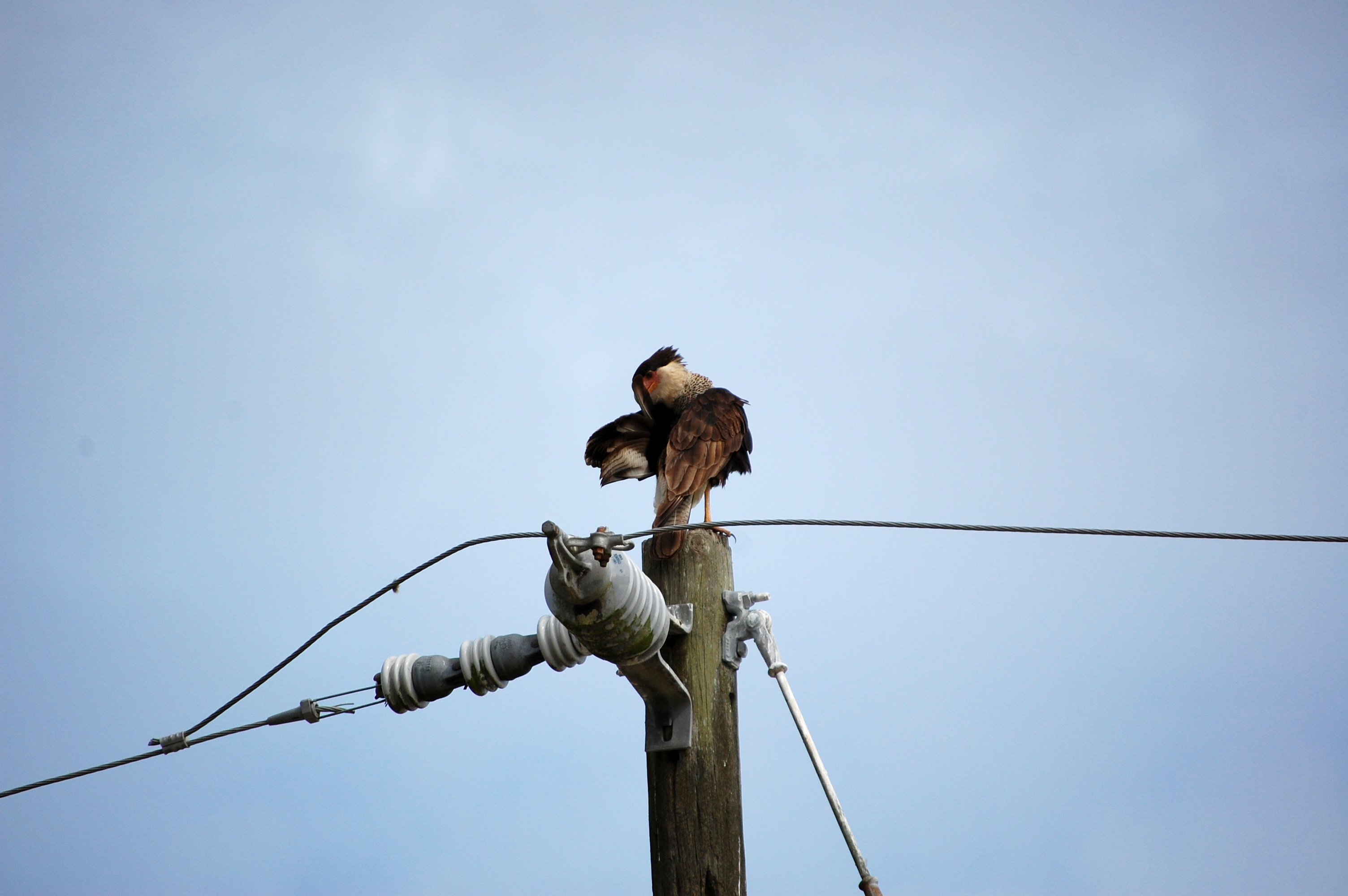 When we saw them together, we felt good about our assumption. Since caracara are not sexually dimorphic (the males and females look the same), it can be difficult to tell which is which. However, it’s a general rule in the bird of prey world that males are slightly smaller than the females. Once we had the chance to see the two next to each other, it did appear that the one that came from the tree was slightly larger. When she first appeared, she actually jumped on top of the male. From what I understand, it’s not clear why the female might do this to the male. Harris hawks out west will stand on top of each other in a behavior known as “stacking” to get a better view across the desert landscape. However, I don’t see why this would be necessary when standing on a tall pole. Whatever the reason, it didn’t last very long and she quickly hopped off.
