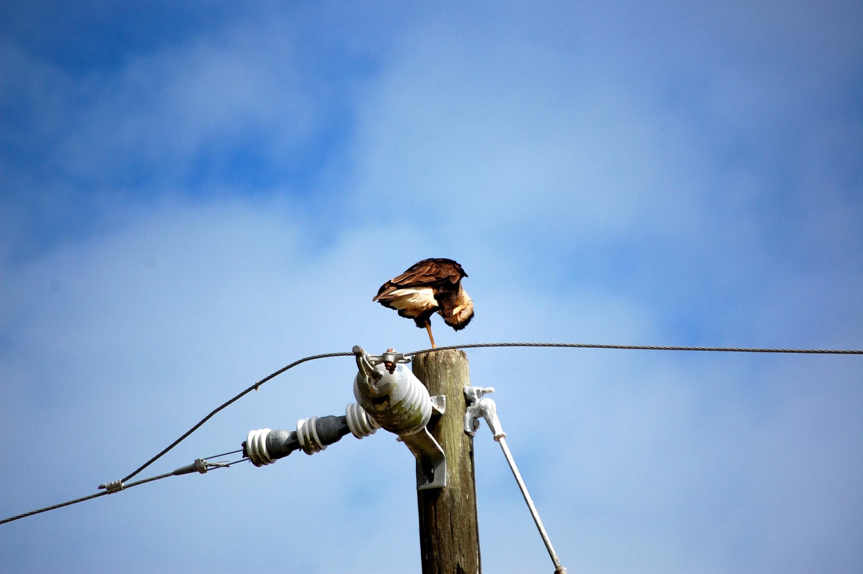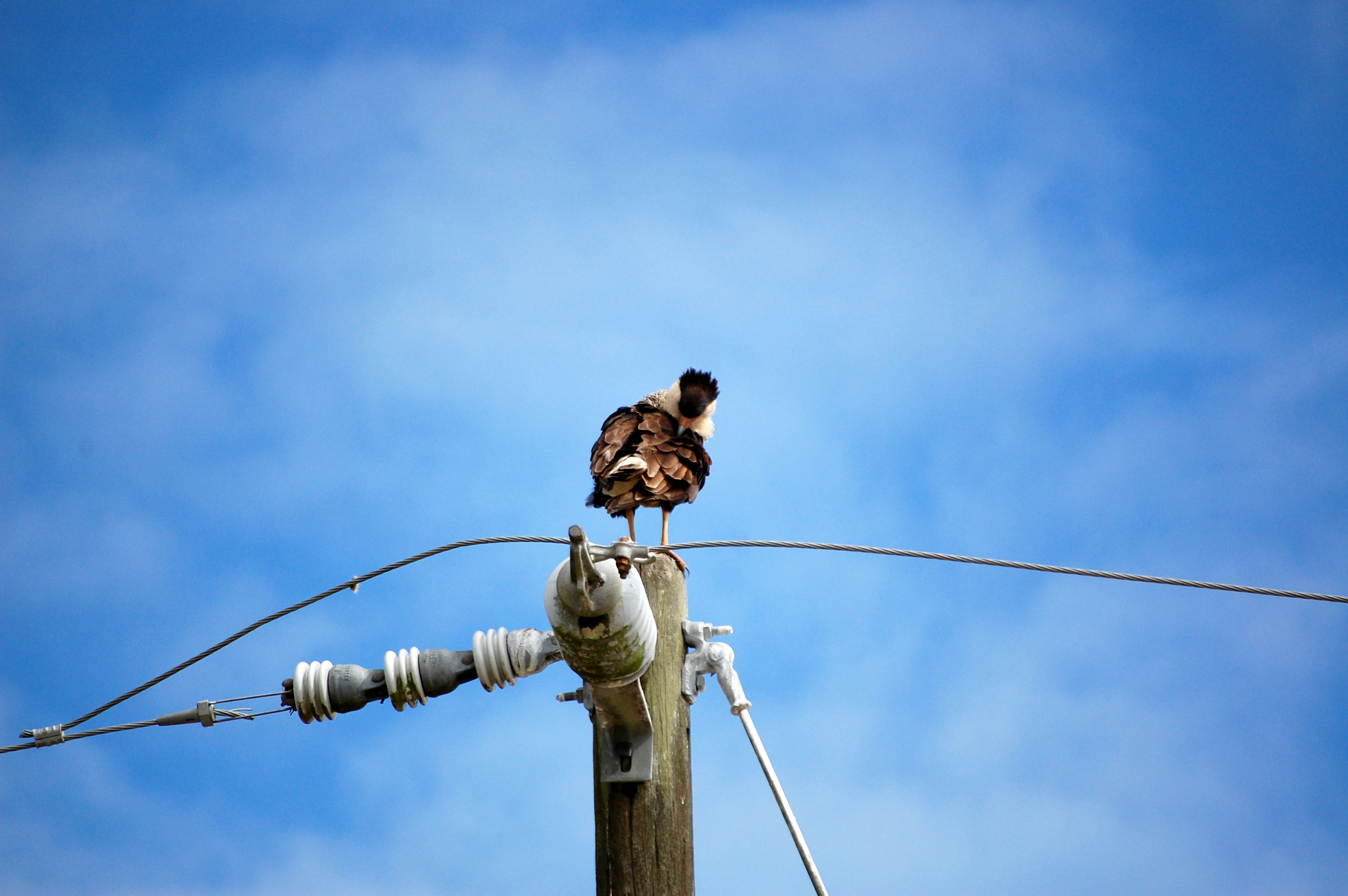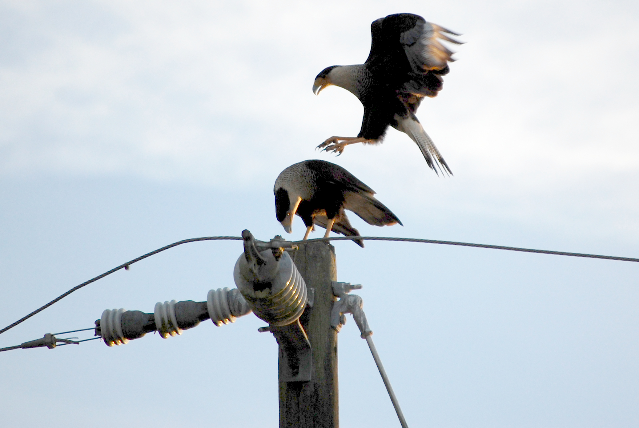 When we saw them together, we felt good about our assumption. Since caracara are not sexually dimorphic (the males and females look the same), it can be difficult to tell which is which. However, it’s a general rule in the bird of prey world that males are slightly smaller than the females. Once we had the chance to see the two next to each other, it did appear that the one that came from the tree was slightly larger. When she first appeared, she actually jumped on top of the male. From what I understand, it’s not clear why the female might do this to the male. Harris hawks out west will stand on top of each other in a behavior known as “stacking” to get a better view across the desert landscape. However, I don’t see why this would be necessary when standing on a tall pole. Whatever the reason, it didn’t last very long and she quickly hopped off.