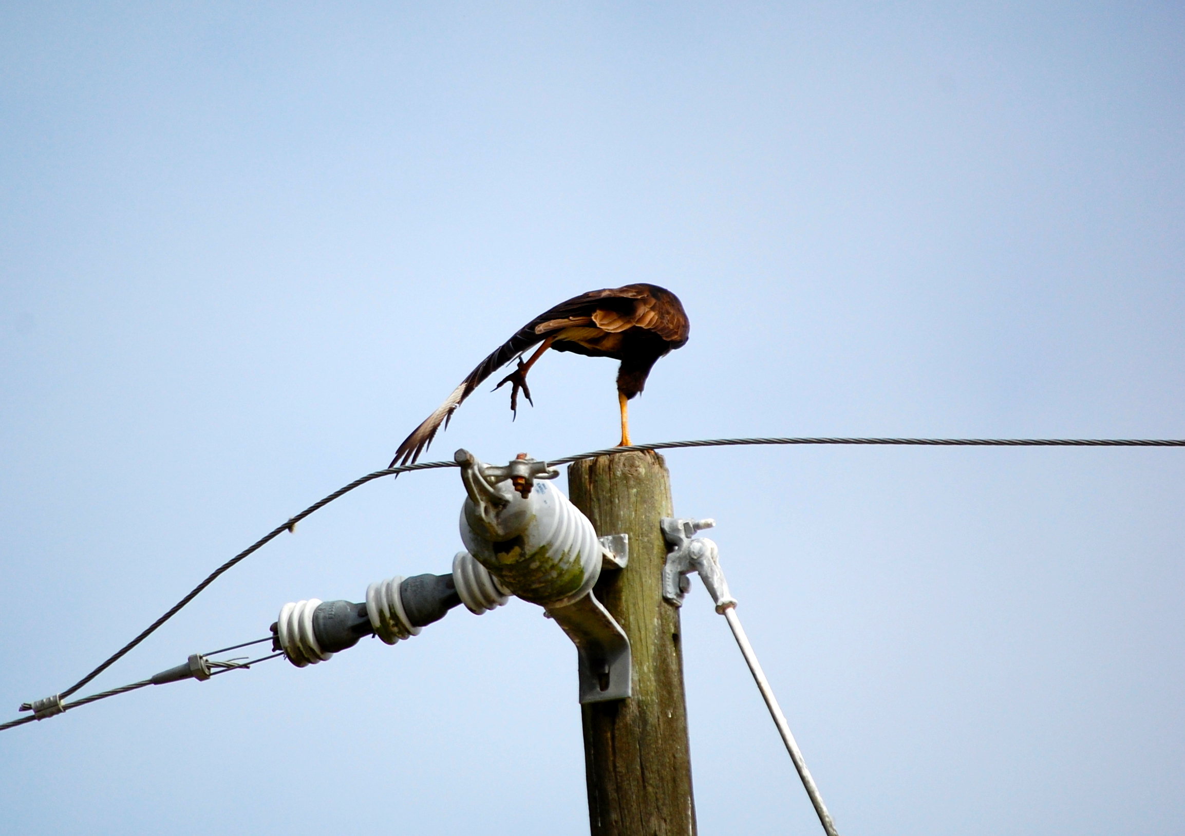 Whatever it was, it got her attention and she left the nest, first stopping at their favorite pole. At this point, he had already taken the treat down to the ground in a nearby pasture.