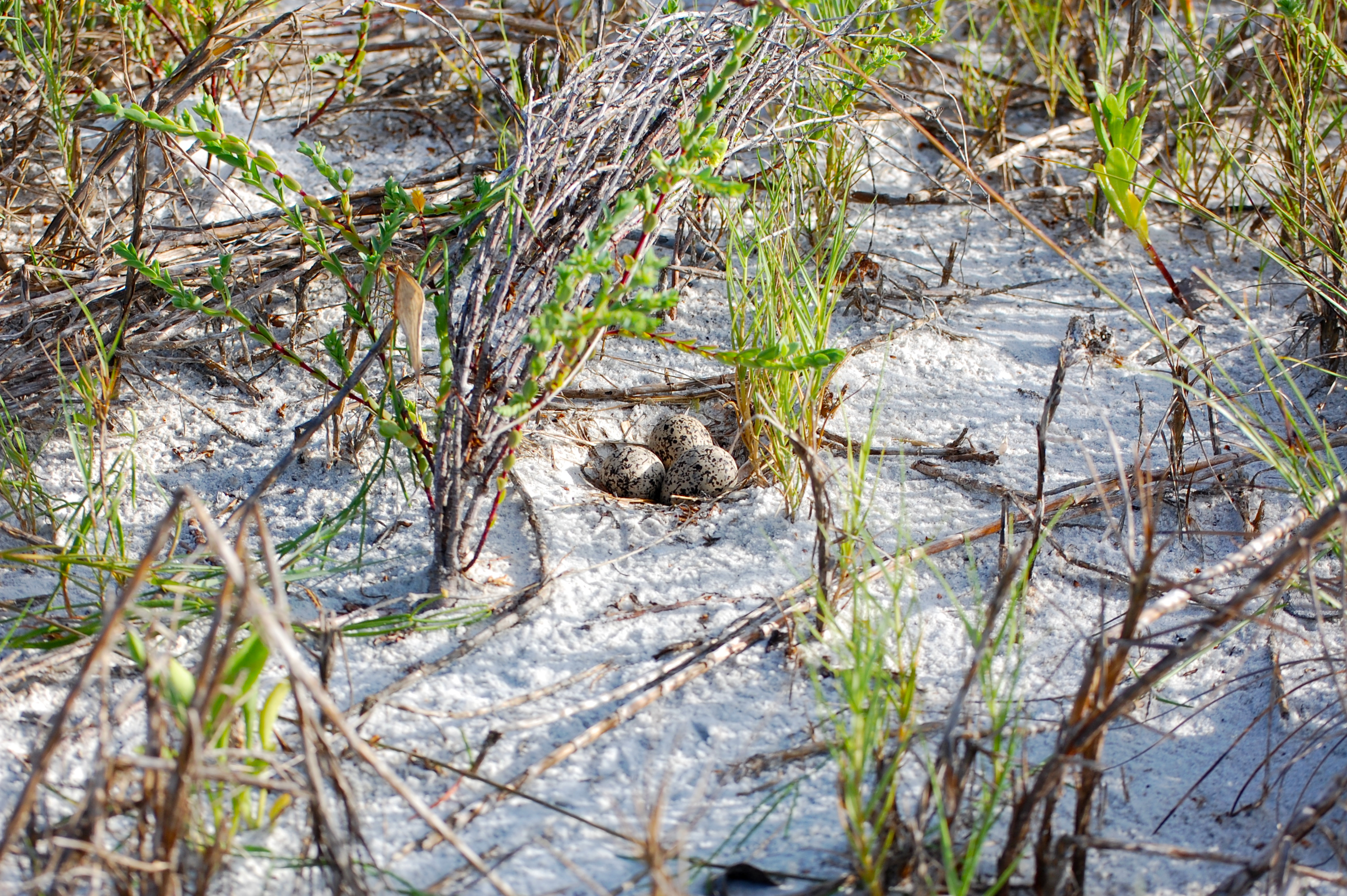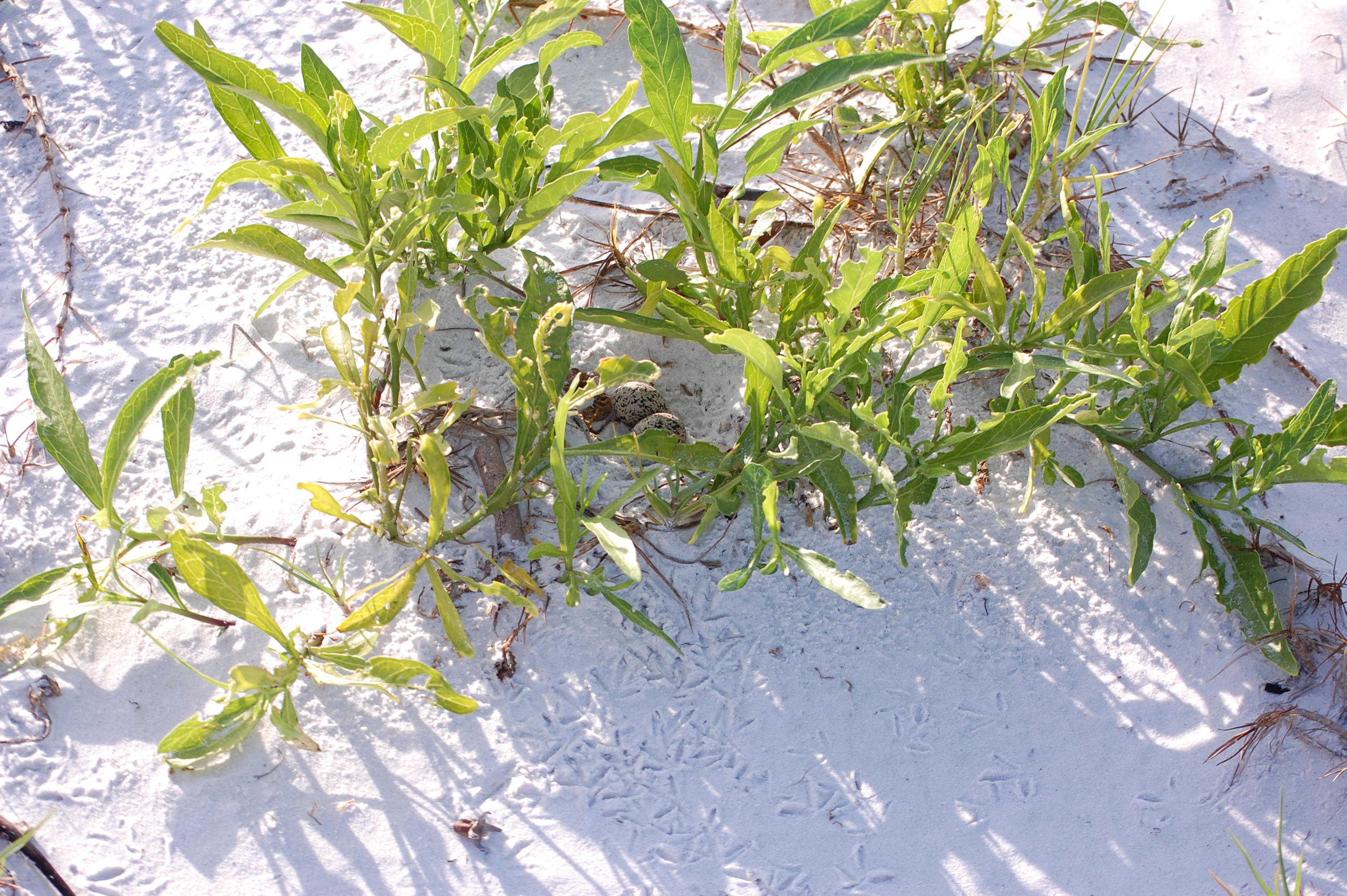 One nest that is quite a bit more difficult to find is that of the Wilson’s Plover. During the visits for my last writing, we got to see a couple small test scrapes. Now, further into breeding season, we were able to find a couple of actual nests. Here you can see the nest that is usually somewhat hidden in the vegetation. With eggs that are camouflaged in the sand, you can see how easy they can be to miss. It’s also not uncommon for the adults to leave the nests like this early on in incubation. This is why it is so important not to cross dunes in undesignated areas. You can also see the little footprints that led us to the nests. These footprints look very similar to those of the various doves, which we also saw a lot of. However, plover footprints include only the front three toes, whereas dove footprints also have a small dot on the back side.