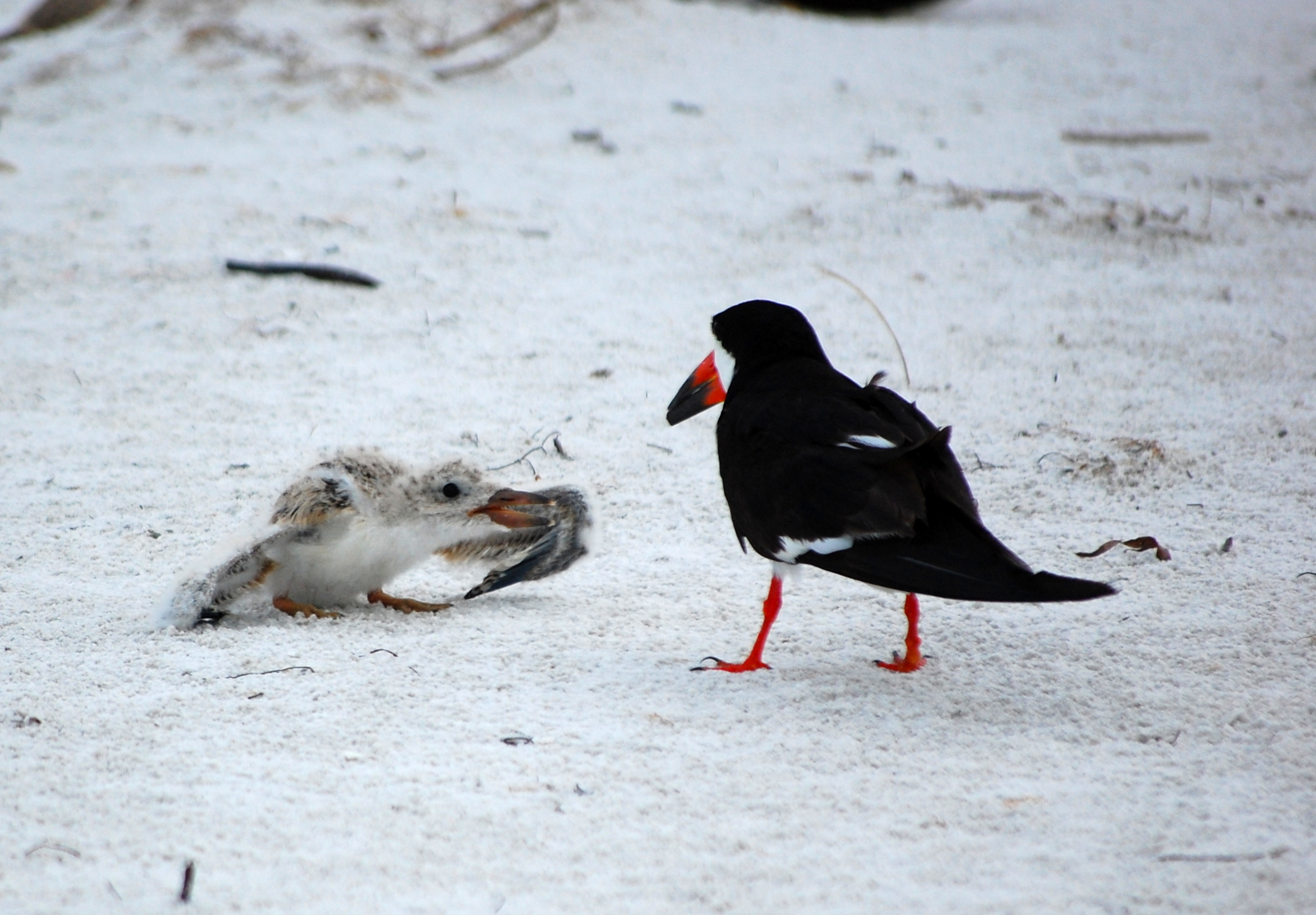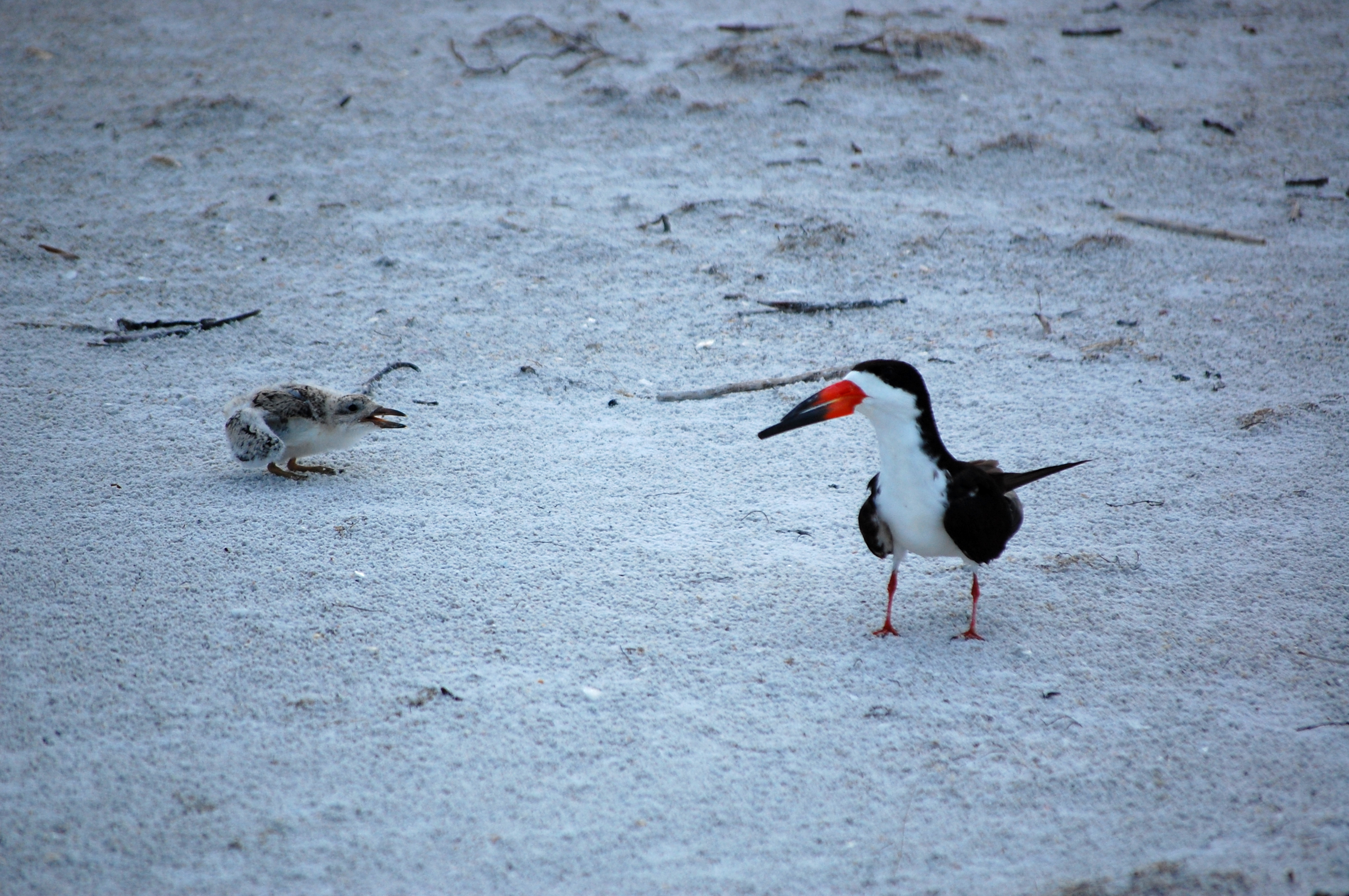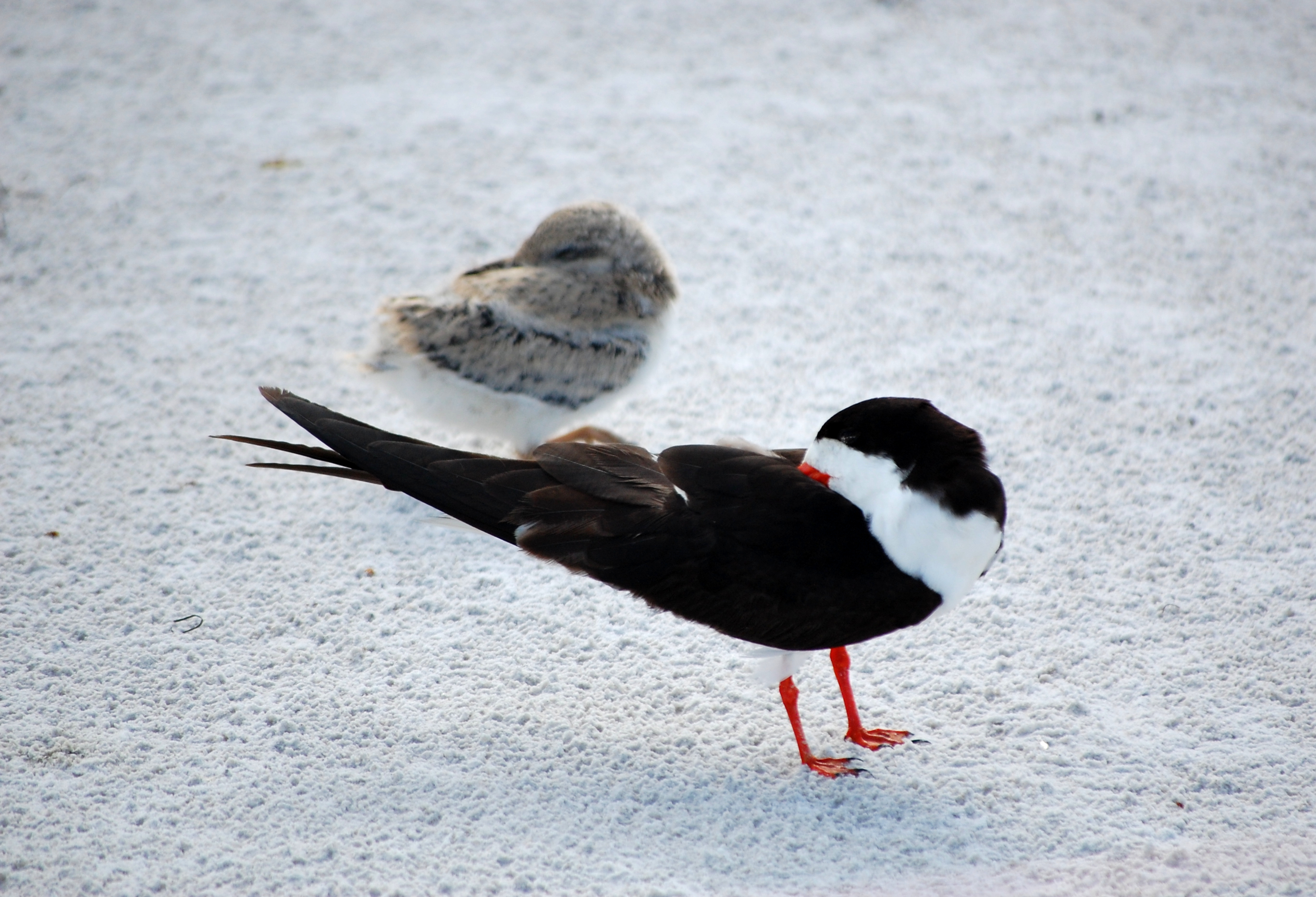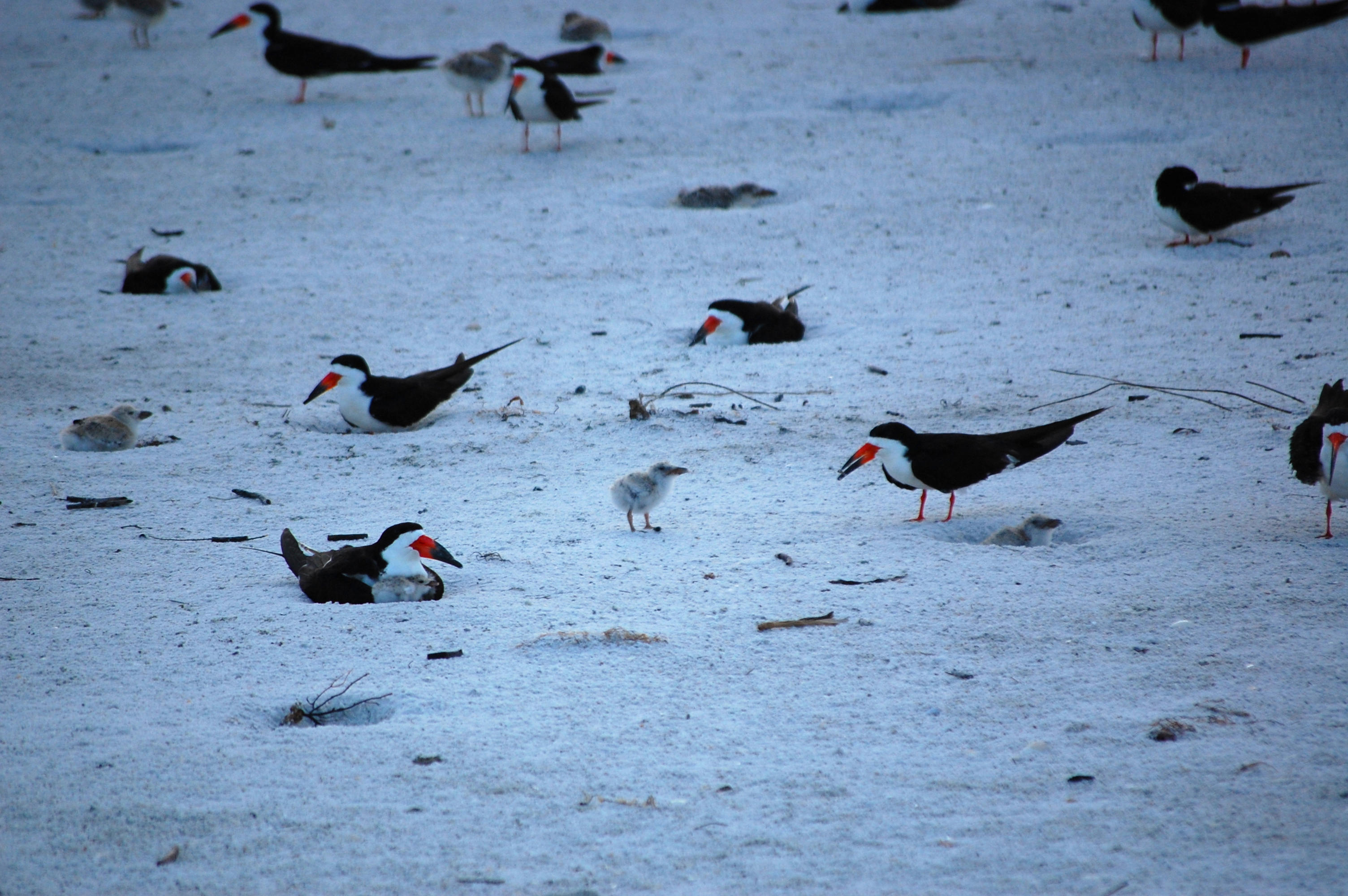 I took a ridiculous number of photos at this next colony, for several reasons. One, the bird itself is quite photogenic. Second, there were so many interesting behaviors occurring. And third, of course, the babies are cute. This is the Black Skimmer that I have mentioned before. This is a very active colony on the beach of Reddington Shores. It was a wonderful experience for my monitoring, as we saw nearly every stage of young (we did not see flight-capable young or eggs). This first one is interesting because it shows many different stages of raising young. In the foreground, to the left, you can see an adult protecting its young chick. Based on the hunkered down posture, we also think that this one may still be incubating eggs (they don’t all hatch at the same time). Behind that, you can see an adult in a scrape. It appears to be resting there and not incubating any eggs. To the right, you can see a chick taking refuge in a scrape of its own with the adult nearby. Finally, behind that are two other adults in scrapes that, based on the posture, may also be incubating. You may notice I’m using non-specific pronouns. This is because, while it could be guessed based on the time of day (although I can’t remember which does it early versus later), both the male and female will incubate the eggs. Furthermore, they are not sexually dimorphic, meaning the males and females cannot be told apart based on any physical characteristics.