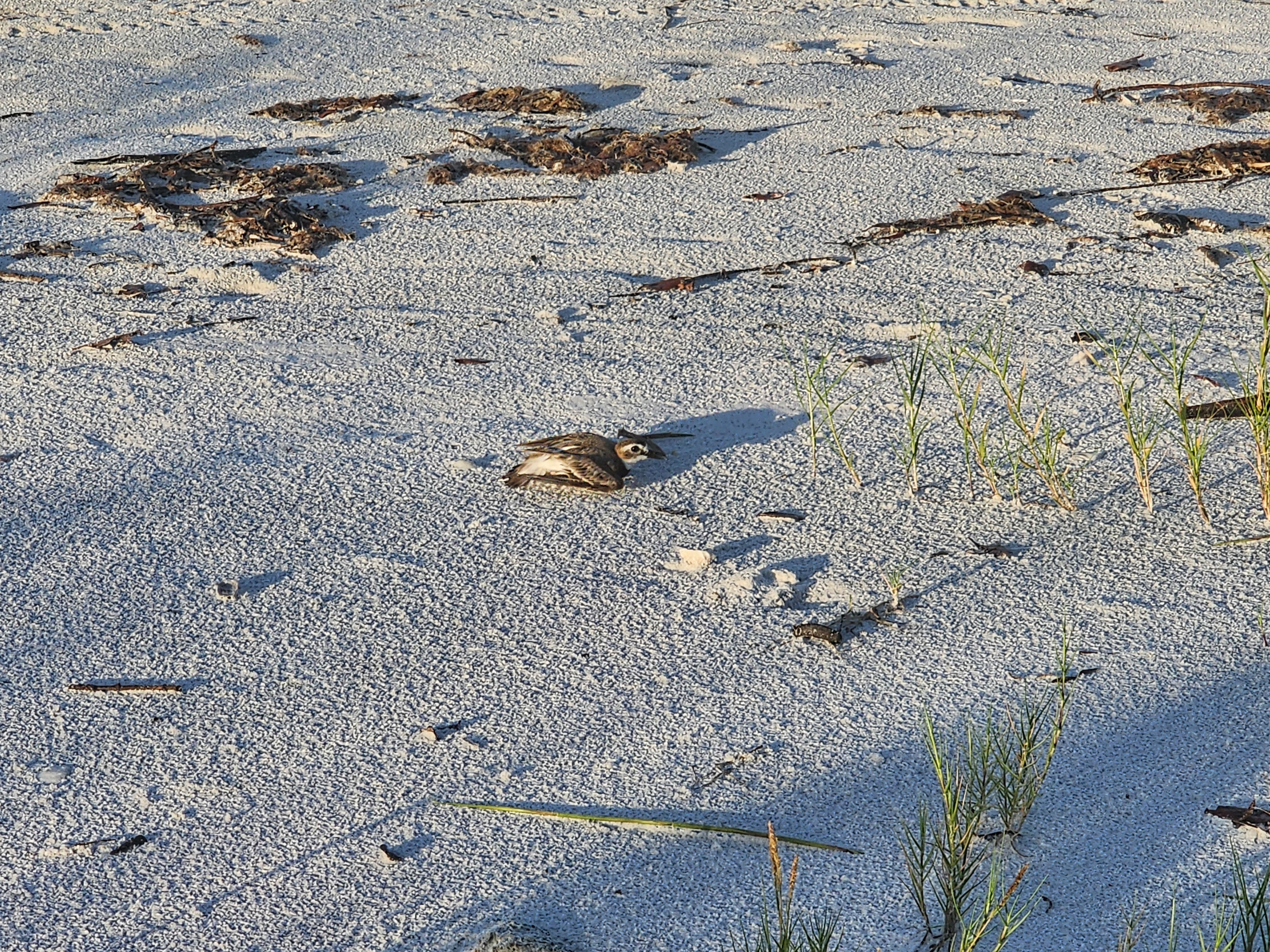 I mentioned the footprints as a way to find where the nests are. We can also look at the behavior of the adults. On a separate survey, in an area where no nests had been previously found, I did see a pair of Wilson’s Plovers on the beach. I watched them carefully as I searched the dunes. Suddenly, I saw a very cool behavior from one of the adults. It’s called a broken wing display. Basically, this adult bird is defending the nest by pretending to be hurt. Seeing me as a predator, it is trying to get me to go after it as vulnerable prey. Had this been a possible impact area, I would have found the exact nest location and created a buffer with rope and signs to keep people out of the area. However, this was about a half mile from any potential impacts, and it wasn’t worth the stress on the adult. So, we marked the area as a possible nesting site and left it alone.
