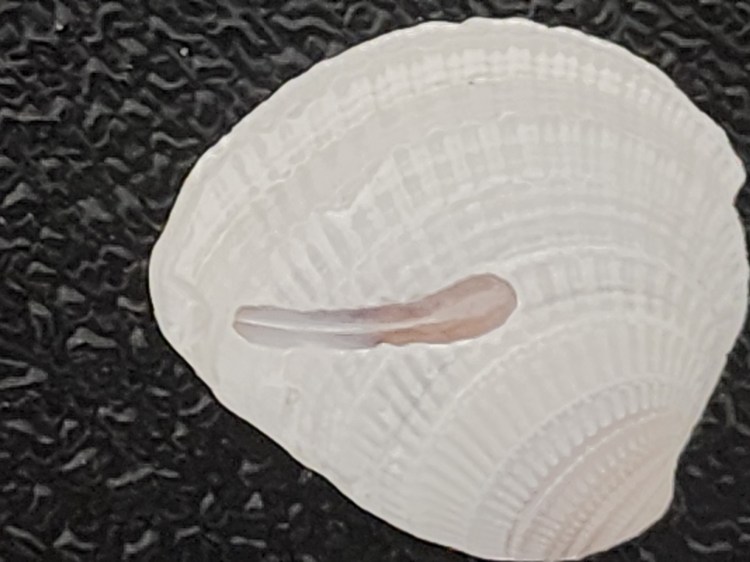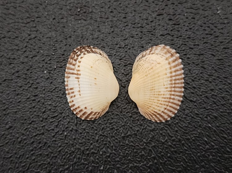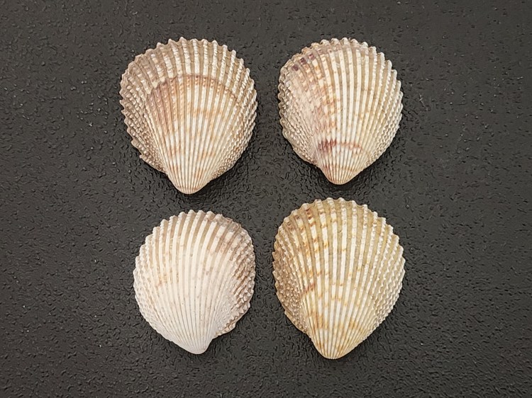 From here on, the shells are smaller but, in my opinion, get a little more interesting. I’ll start with another much smaller cockle. This is the Florida prickly cockle (Trachycardium egmontianum). This photo below has three right shells and one left.