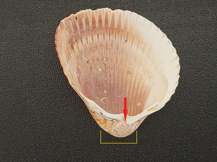 The portion of the shell where the ridges all start to come together (yellow box) is known as the umbo. The endpoint of this umbo (red arrow) is known as the beak. If you had the complete animal, you would rotate it such that the beak was pointing down and away from you. This would tell you which side was the left or right. If you can imagine rotating this one into such a position, you’d see that this would be considered the right side.