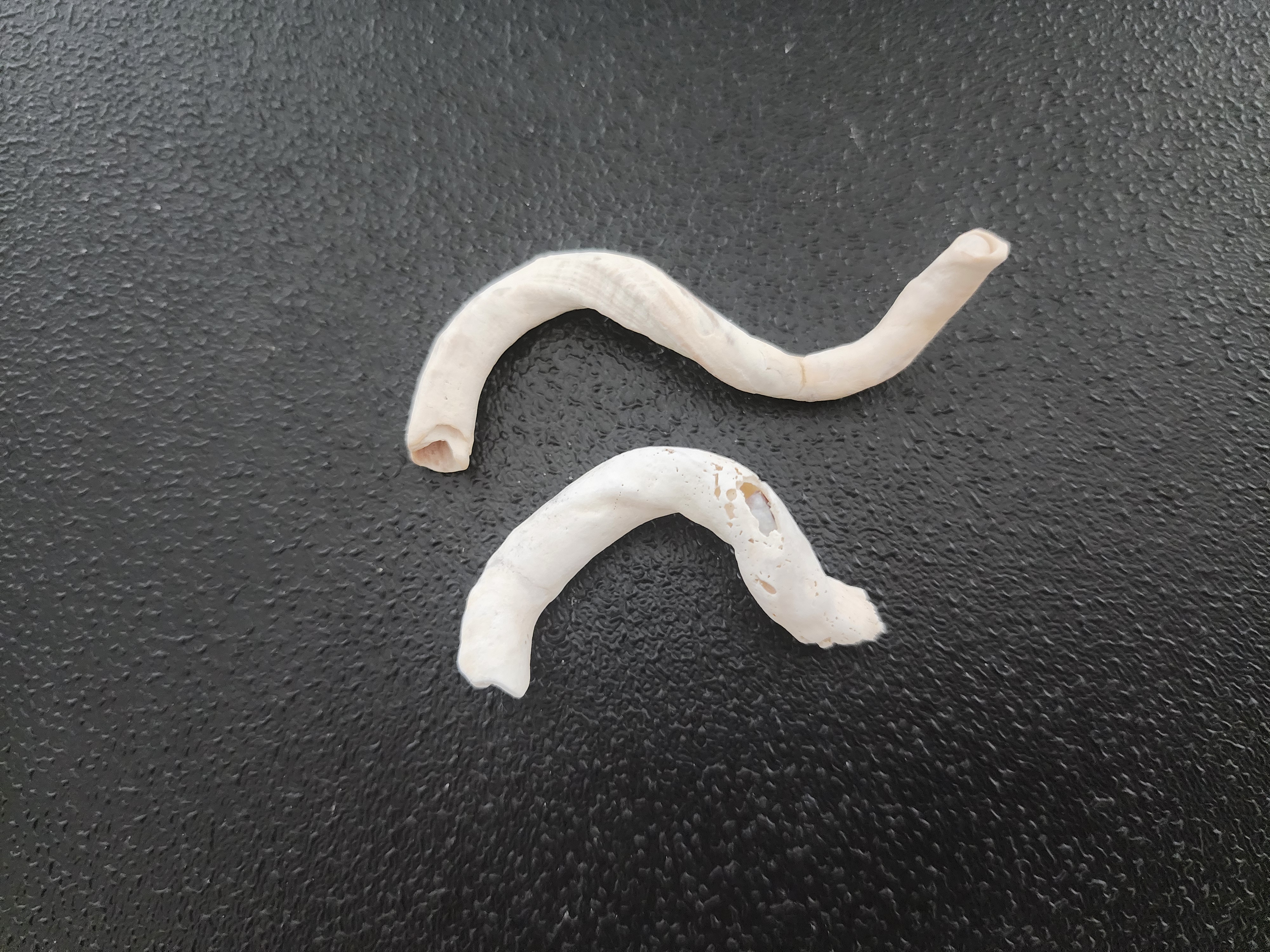 This first shell is not very interesting to look at, but the animal it came from is quite fascinating. This is what’s left of the shell of a wormsnail (Vermicularia spp.). There are two species of wormsnail that these could have come from – the West Indian wormsnail (V. spirata) or the Florida wormsnail (V. knorii). This is showing just the business end of the shell. The other end would be more tightly spiraled, like you would expect of a snail shell, and would have the features needed to identify to the species level. These snails attach themselves to coral or sponges and feed using cilia that protrude out and produce a mucous net that catches plankton, a feeding strategy known as suspension feeding. They start off more coiled early in life, then uncoil as they grow older.