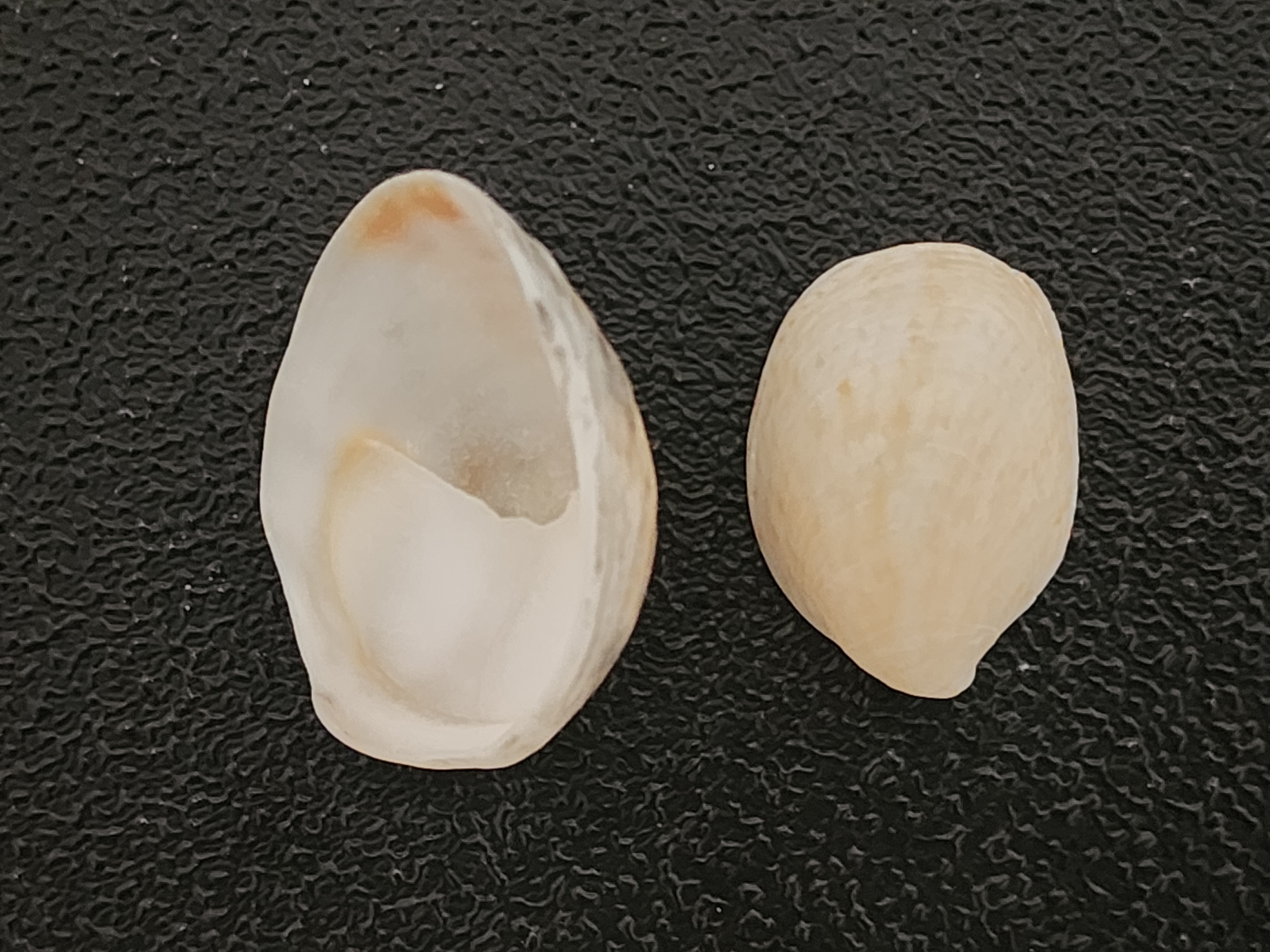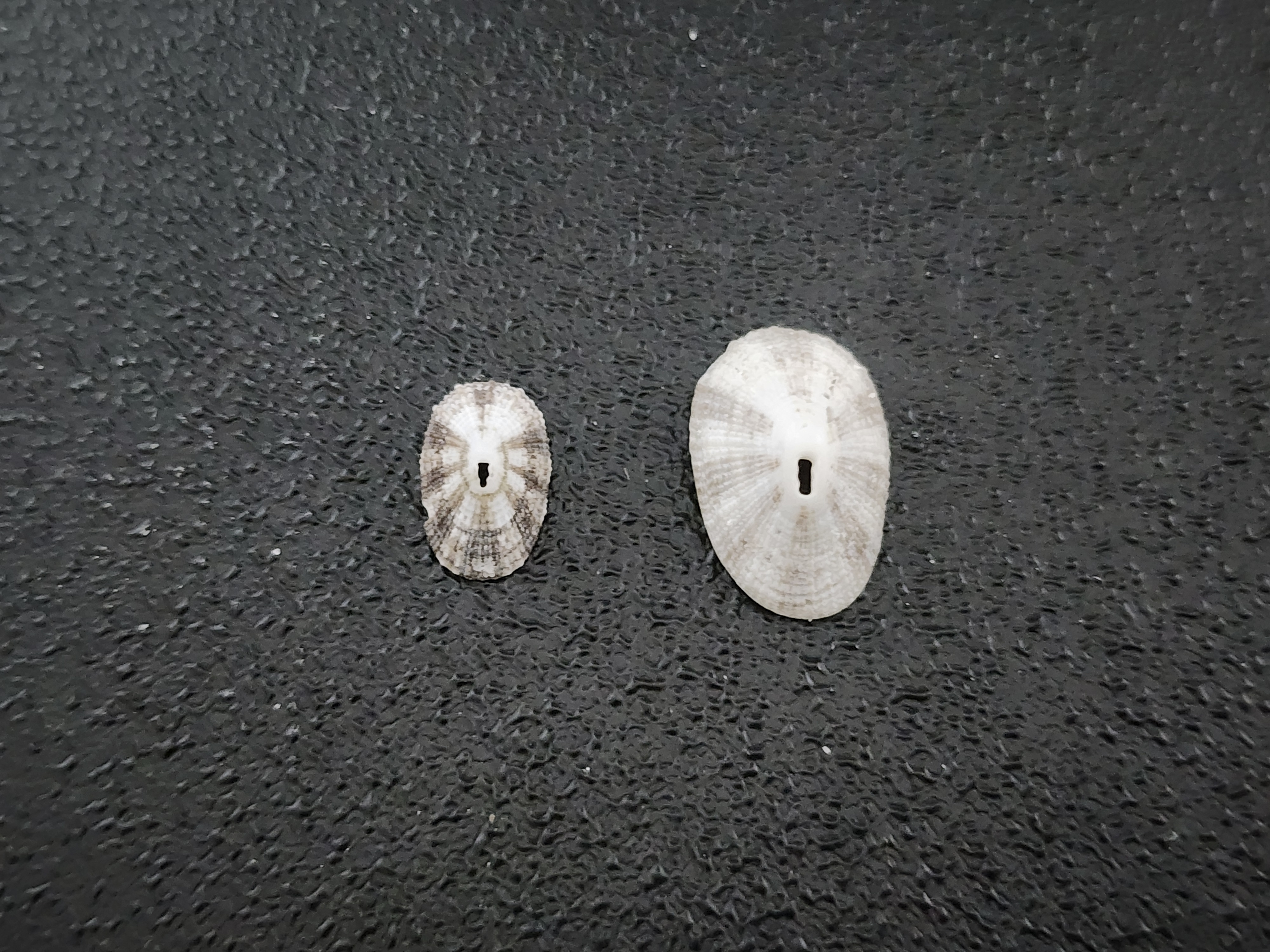 This next shell belongs to an animal you may have seen before and passed right by it thinking it was a barnacle. This is known as a keyhole limpet. Specifically, based on every other radial rib being a different size (impossible to tell from the photo), I believe these to be from Lister’s keyhole limpets (Diodora listeri). Despite their small size and nearly sessile nature, they play a very important role in the marine ecosystem as they control algae on rocks in tidal areas. During high tides, they move very slowly across the rocks, feeding. They somehow predict the tides and, before the tides go out, they pick a resting spot where they remain dormant and exposed. The “keyhole” at the apex of the shell is used in the gas exchange process. Water is brought in under the edge of the shell, passes over gills, and exits through this hole.