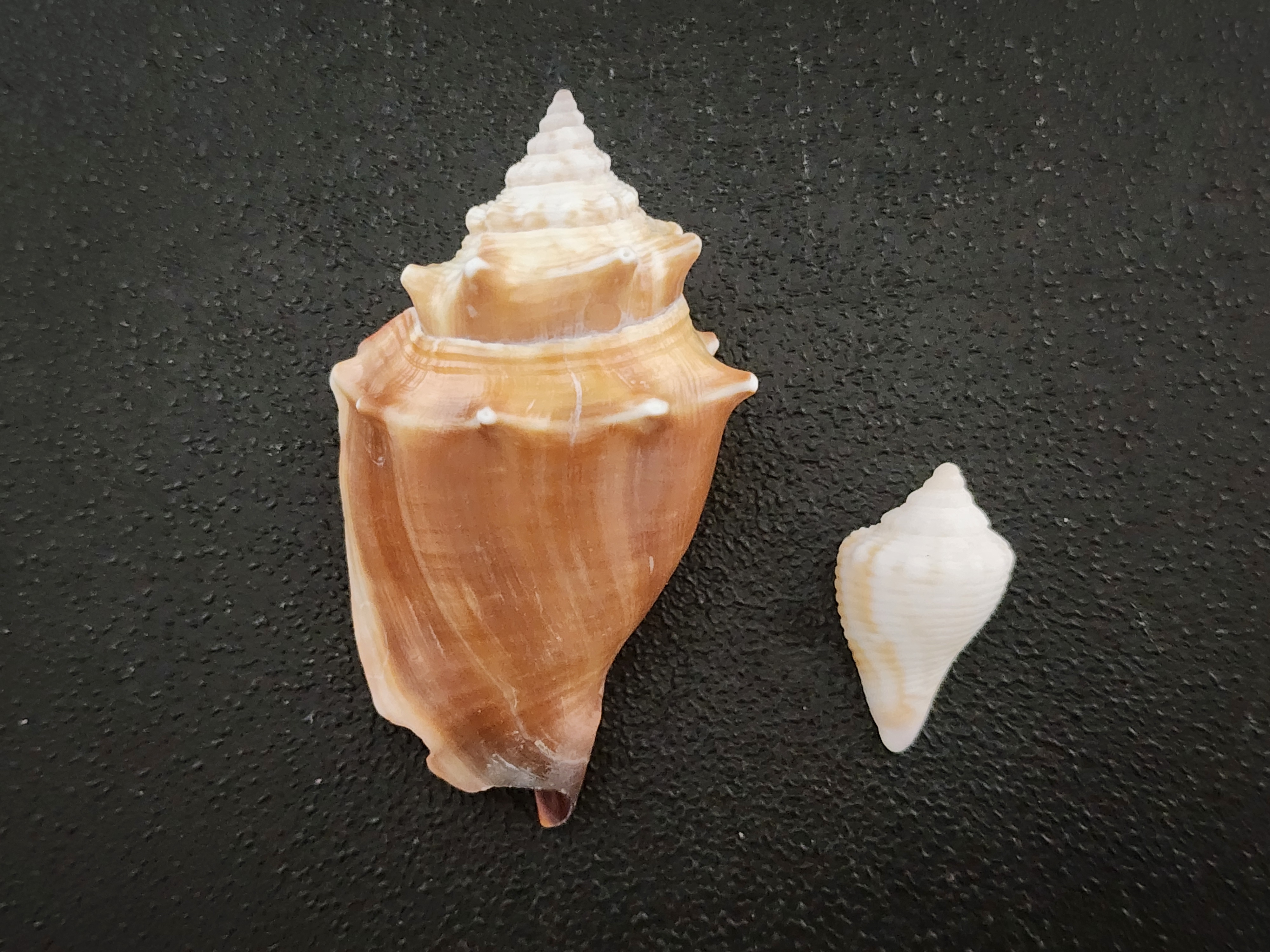 I was very fortunate to have found a larger, intact shell from this next one. This is the unmistakable Florida fighting conch (Strombus alatus). The Latin strombus refers to something that is spun around. The Latin alatus means “winged”. Under normal circumstances, these “fighting” conchs are actually quite peaceful and do not attack other species. However, when two males are competing for a female, they will oftentimes fight each other to the death. The photo below is of an adult fighting conch along with another smaller shell that I found. I wasn’t able to identify it as any of the smaller species, which makes me wonder if it might be a juvenile.