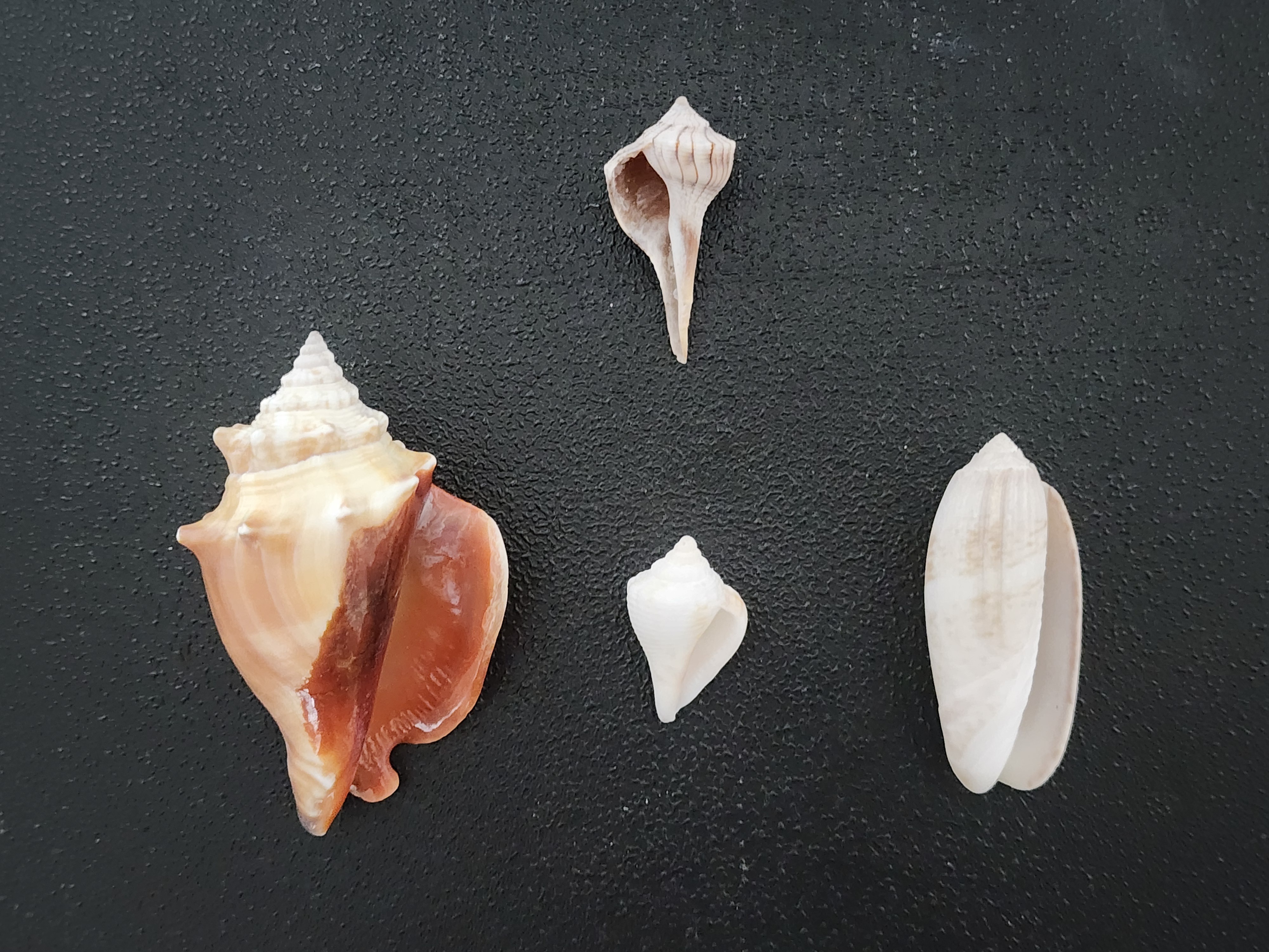 The scientific name makes it sound very…well…sinister. And like with the slipper snails, there is a common root word there. The Latin sinister refers to something being on the left side. There is also a word called “sinistral” that basically means left-handed. And the lightning whelk is one of the only marine snails that is “left-handed”. If you take a snail shell and turn it so the aperture is facing you and the apex is facing up, other shells will have the aperture on the right whereas the lightning welk has it on the left. There are right-handed (dextral) lightning whelks, but they are very rare. Below is a photo of several of my other shells with the lightning whelk, so you can see the difference.