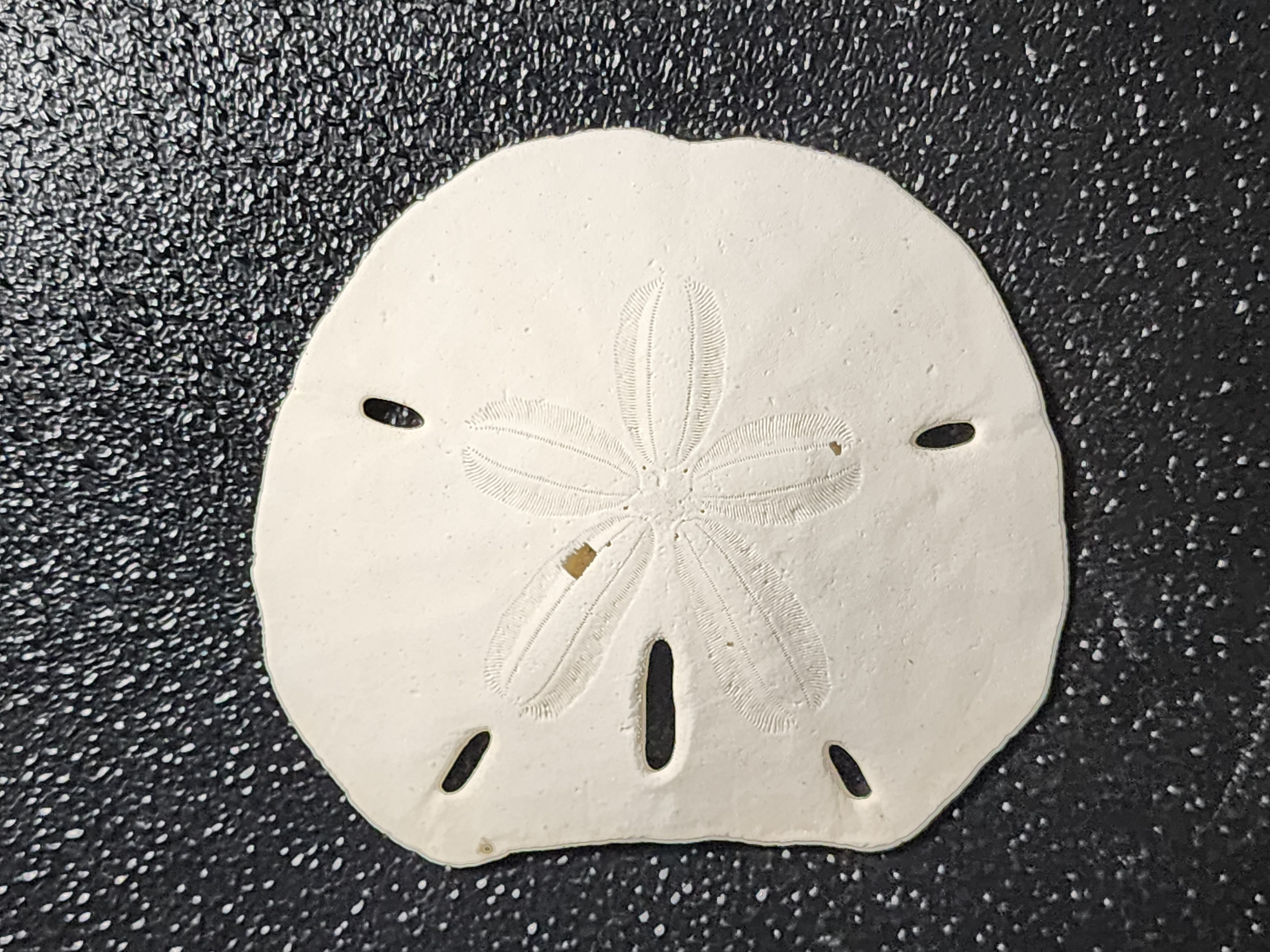 While the look of a sand dollar may be common, especially in Florida, the anatomy that can be viewed just from the shell is something that I personally find fascinating. First, the familiar view from the top. That “flower than you see isn’t just for show. These are known as “ambulacra” where tube feet are located which helps with gas exchange (1). Once a sand dollar has dies, and especially as the shell bleaches in the sun, it becomes very brittle. As a result, there are a couple of divots and holes in the one I found. However, there are some functioning holes as well. The five tiny holes on the tips of the “star” in the middle are known as “gonopores” from which sperm or eggs would be released during fertilization (2). The star itself is known as the “madreporite”, which is where water is brought into the water vascular system (something I could write an entire post on just by itself). The small openings are known as “lunules” and provide for a stronger structure and allow water and sand to pass through. This prevents the structure from acting almost like a hard parachute, which could injure the animal in turbulent waters (3).