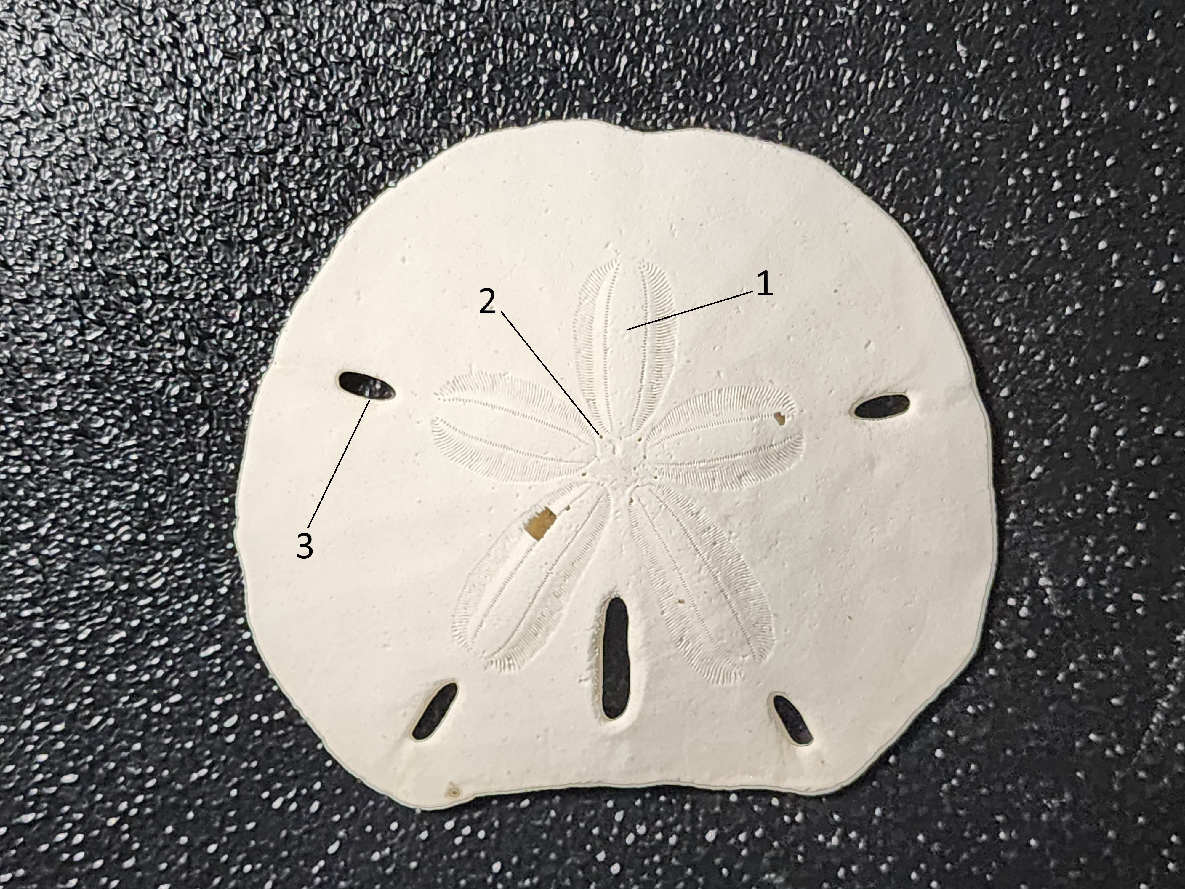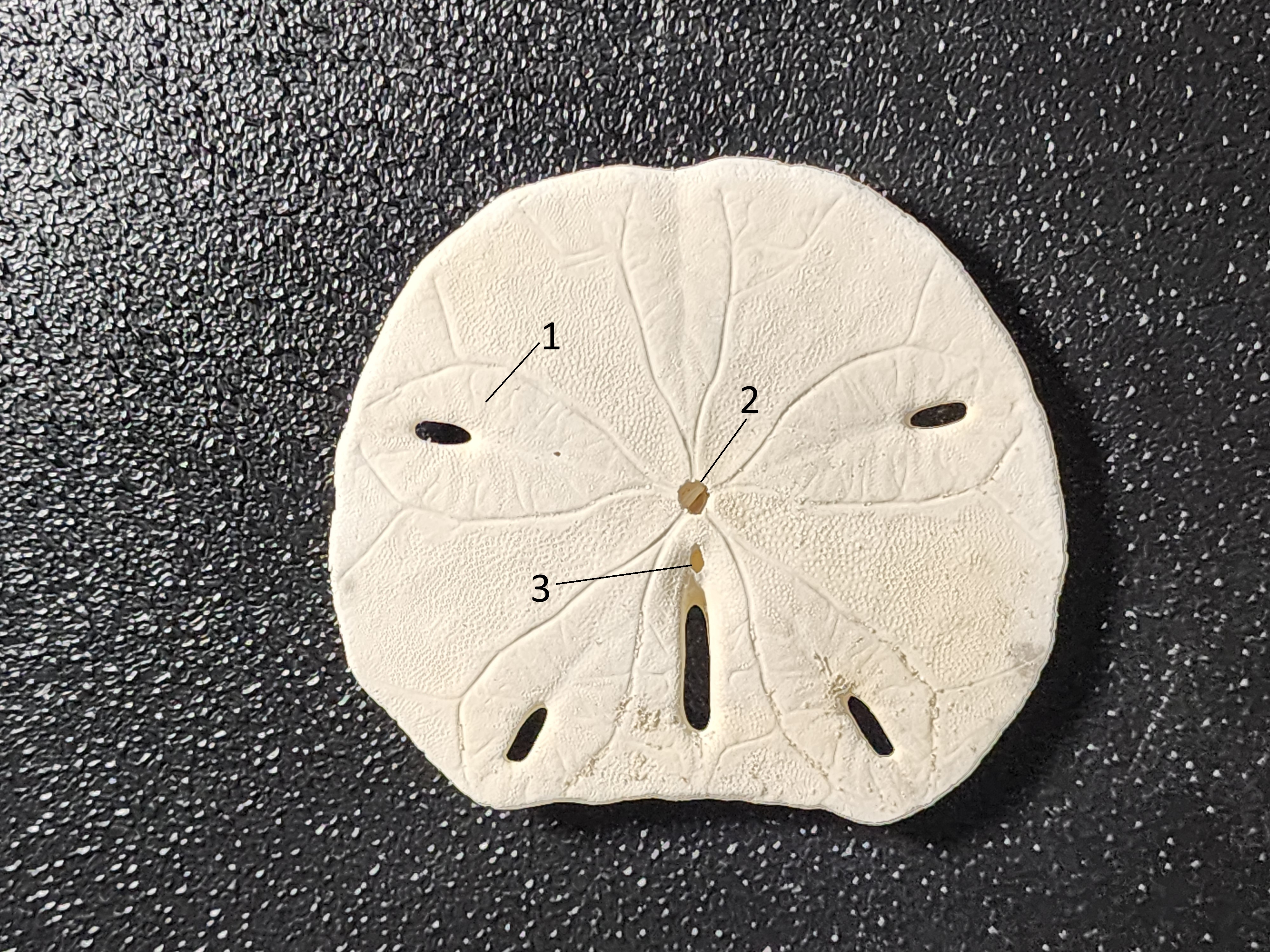 The underside of a sand dollar, for decorative purposes, may not be as attractive. However, a lot more can be learned about how the animal eats. Here we see another flower pattern. Each “petal” is called a “food groove” in which cilia and tube feet guide food particles toward the mouth (1). The mouth itself is located in the central opening (2). Just below this, you can see another smaller opening that is…well…in very unscientific terms…that’s its butt (3).