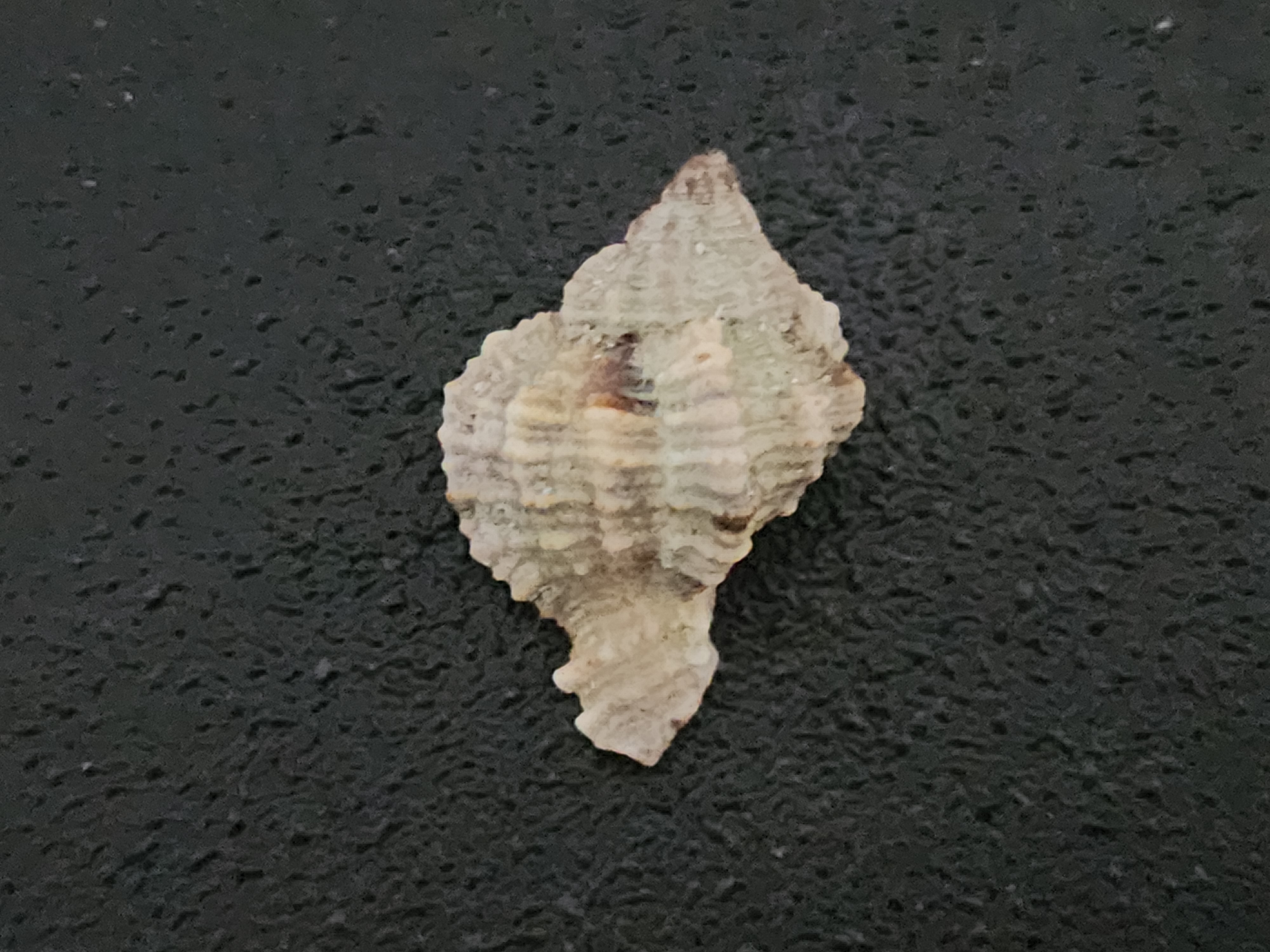 This next shell is quite small but has a beautiful, sturdy form (shout out to my intern, Kailanee, for finding this one for me!). This is the shell of an apple murex (Phyllonotus pomum). Despite the small size, murices are efficient predators, subduing their prey with a venom. This venom was also used by Phoenicians to make the dye tyrian purple. This venomous secretion also acts as an antimicrobial lining for the egg masses. These masses are a congregation of egg capsules from many females within a population.